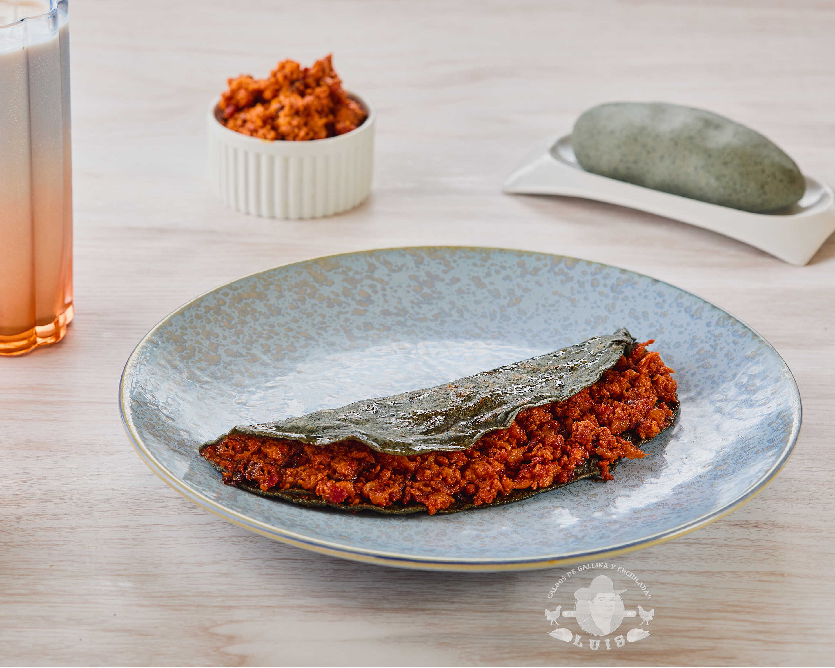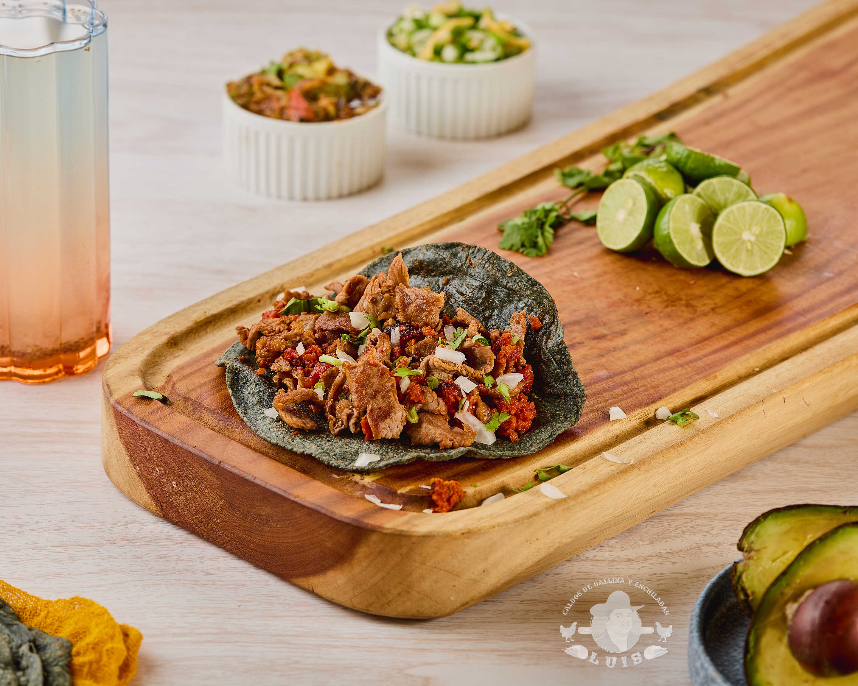 Servido con tortilla hecha a mano acompañado de longaniza y bistec jugoso