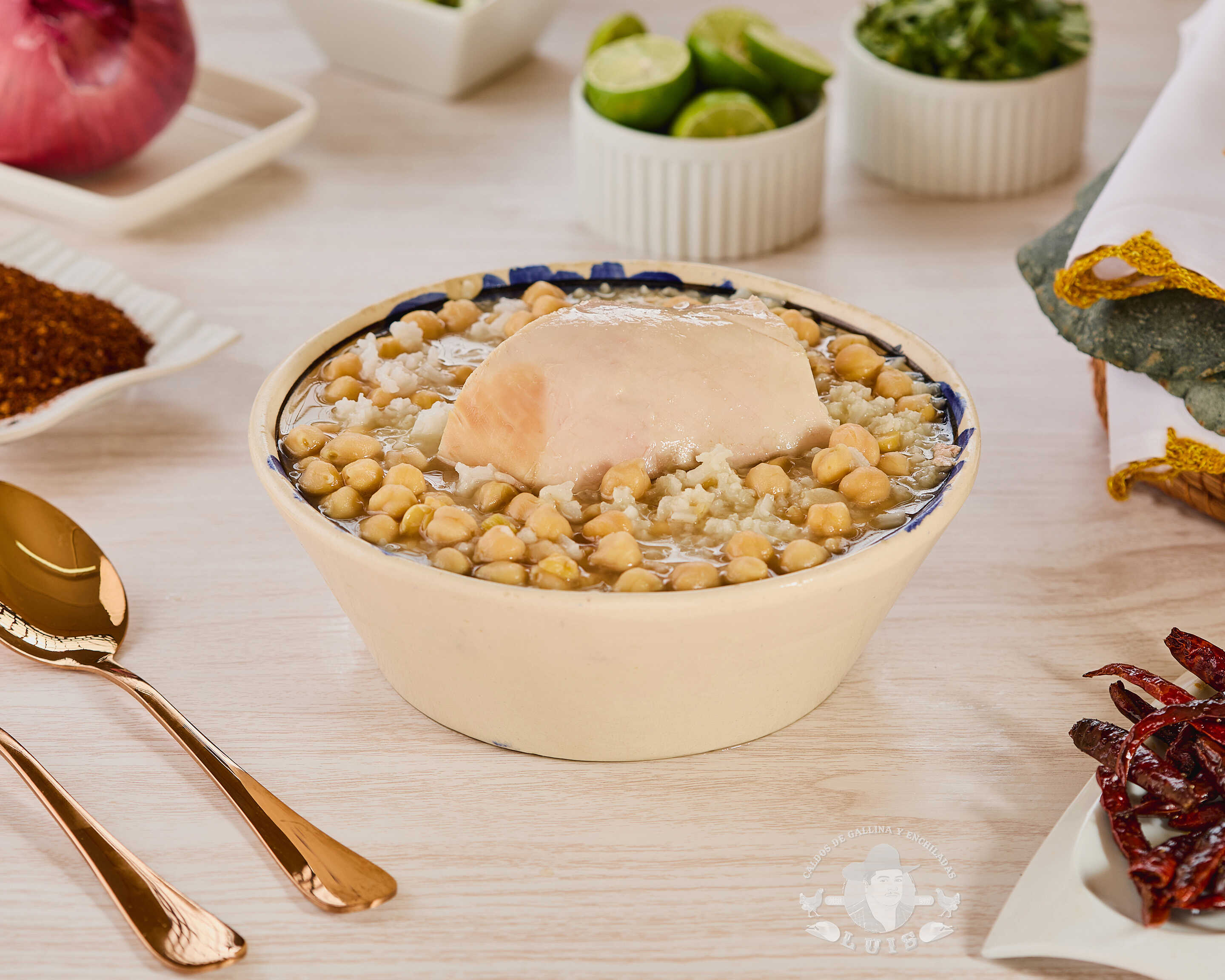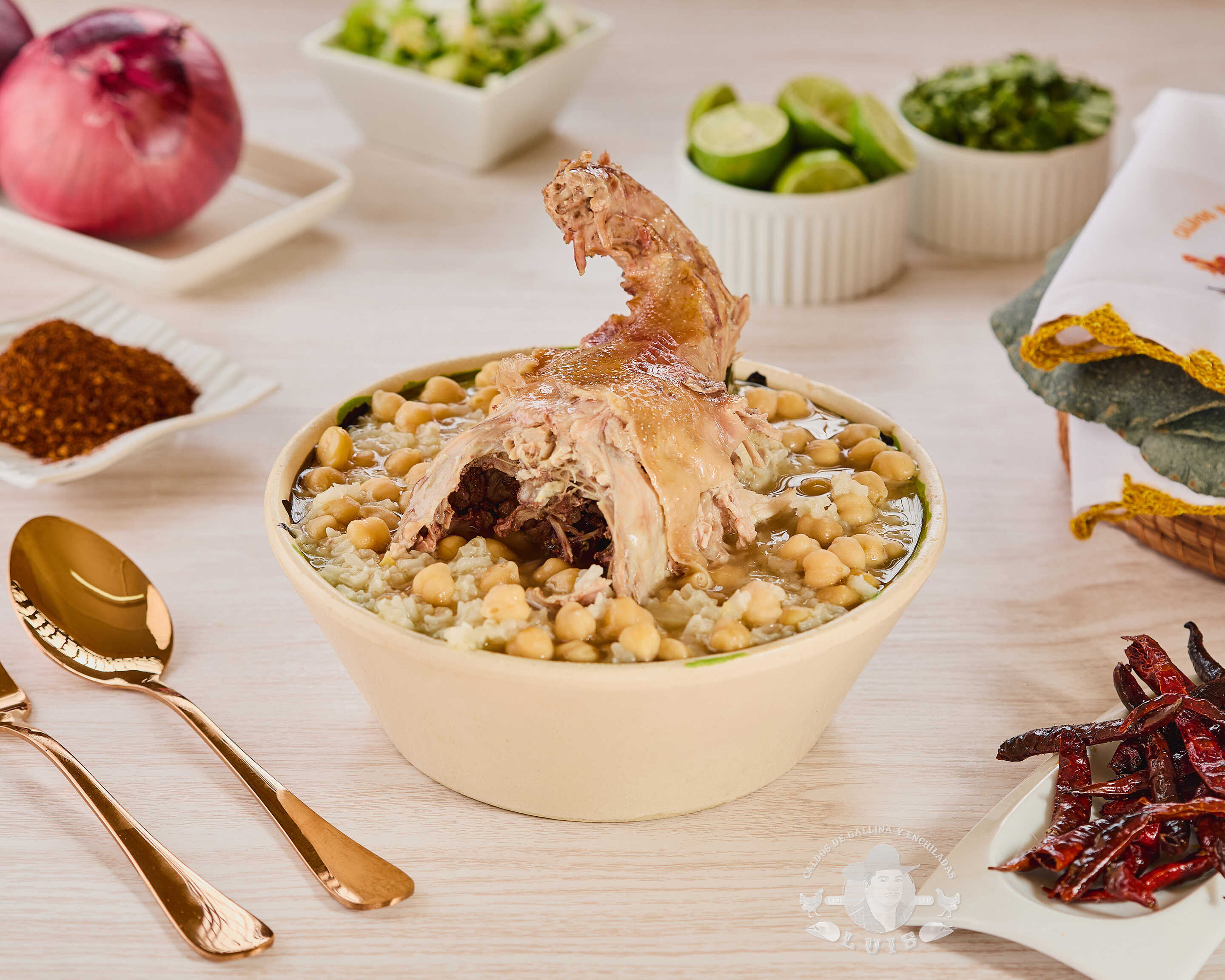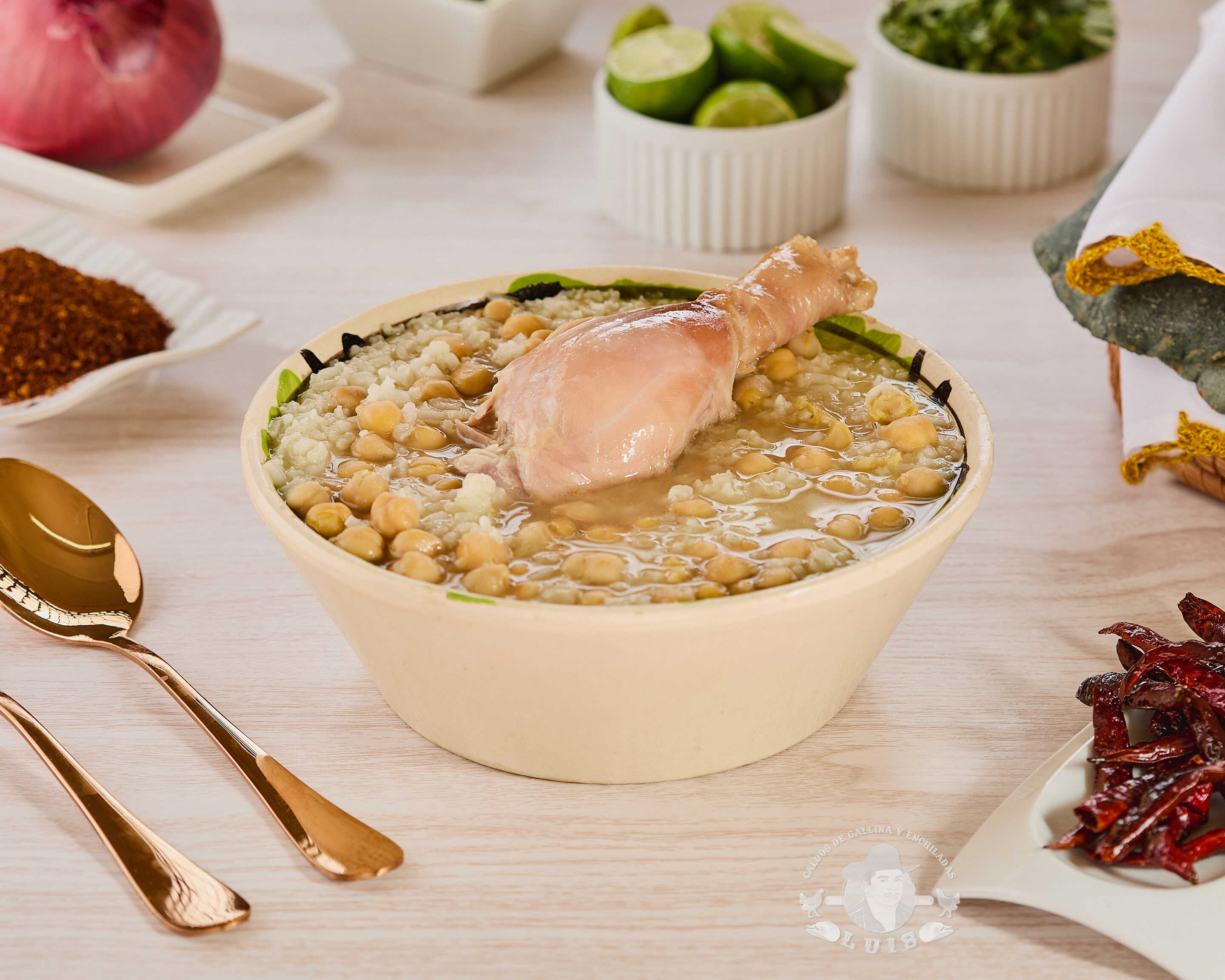 1 litro de caldo de gallina acompañado de garbanzos y arroz.