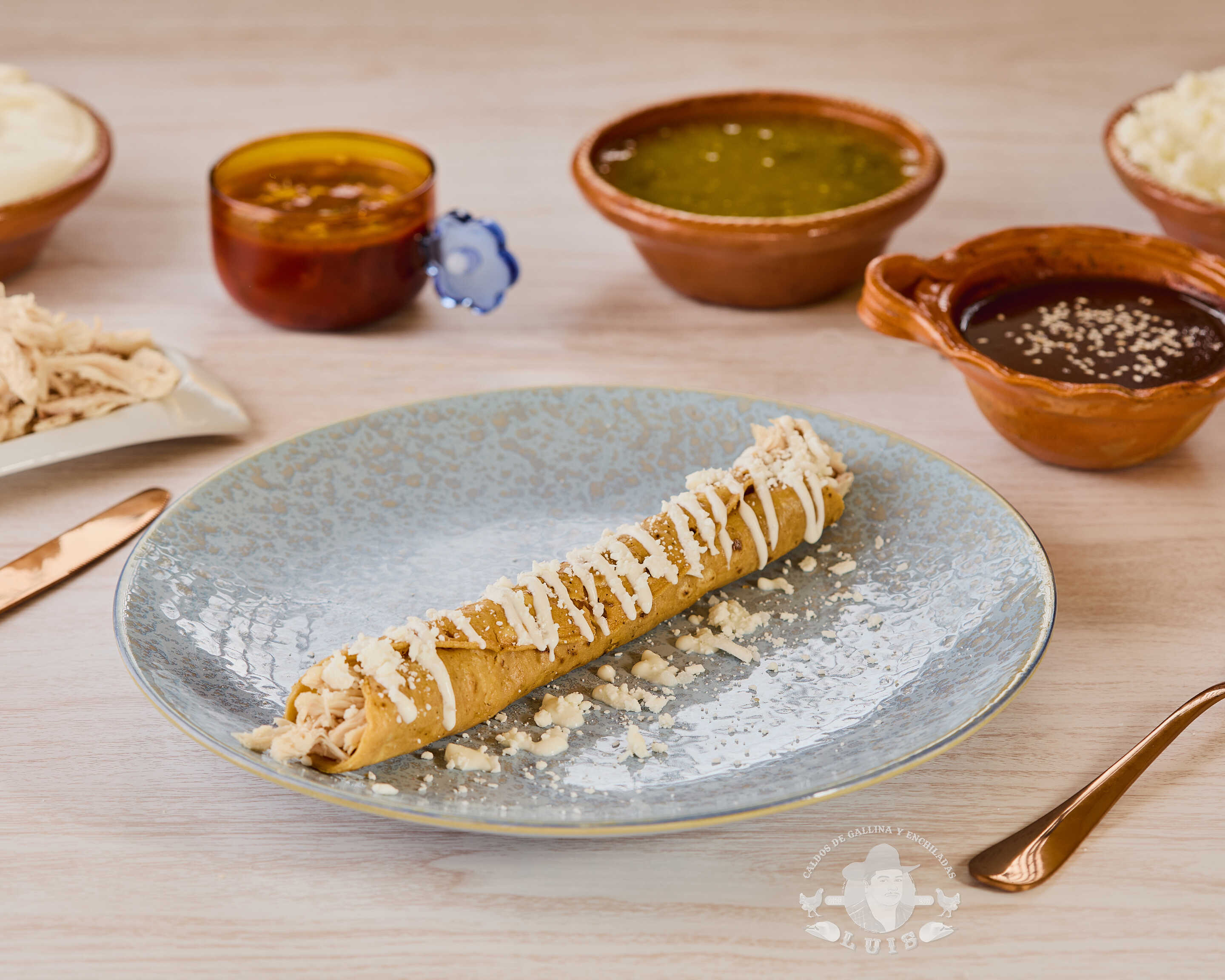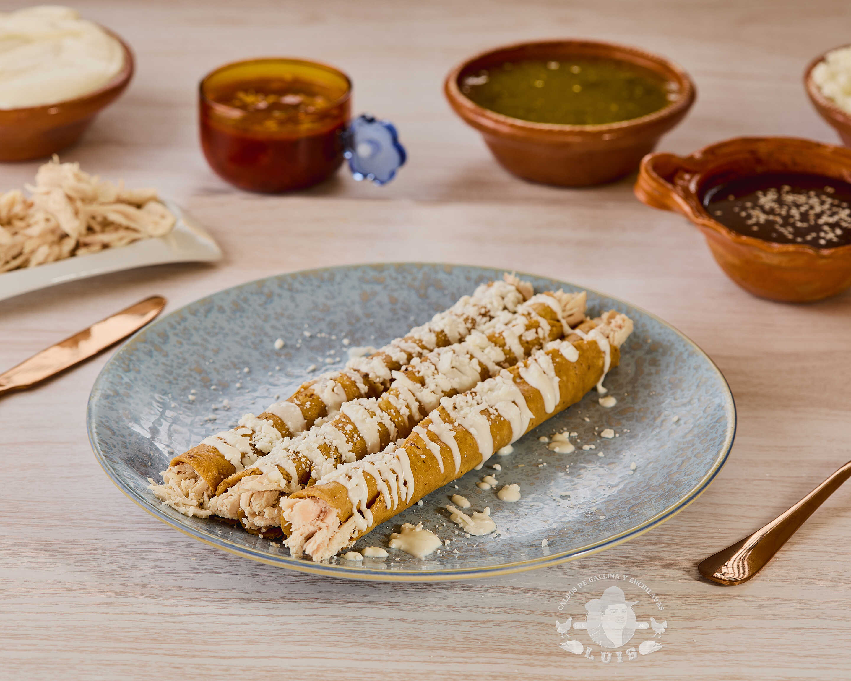3 PZAS. Las flautas traen: Tortilla de maíz y gallina desmechada.