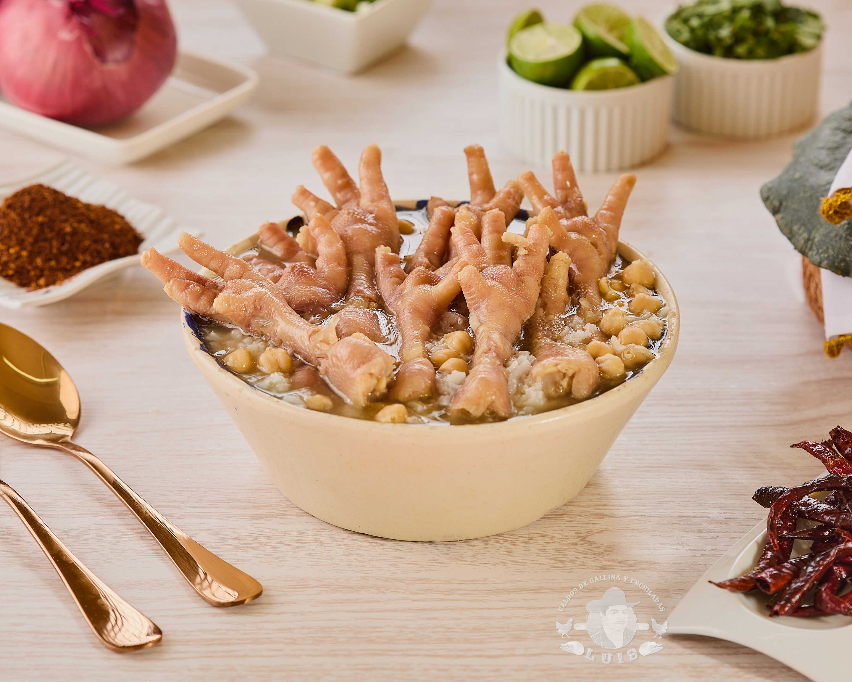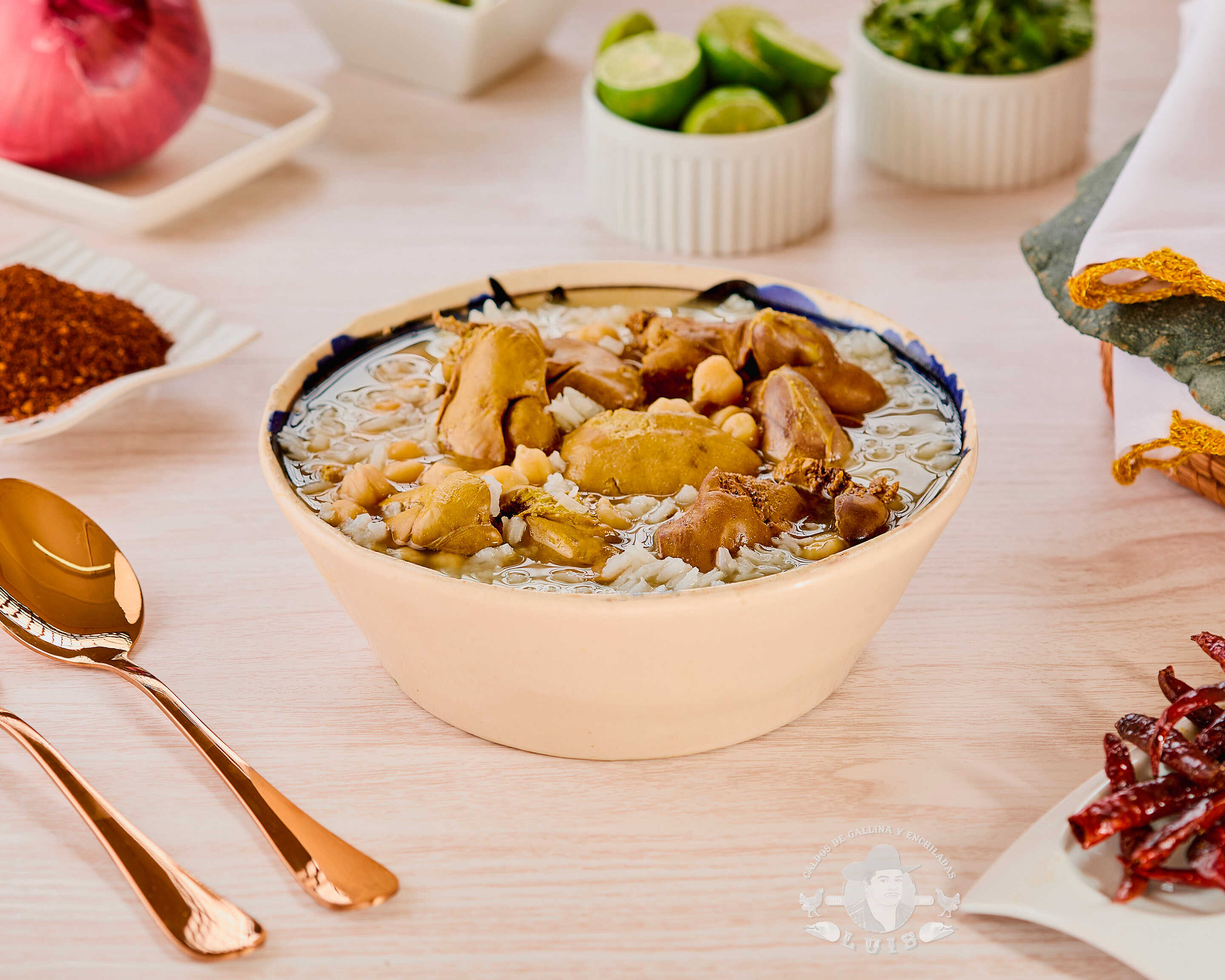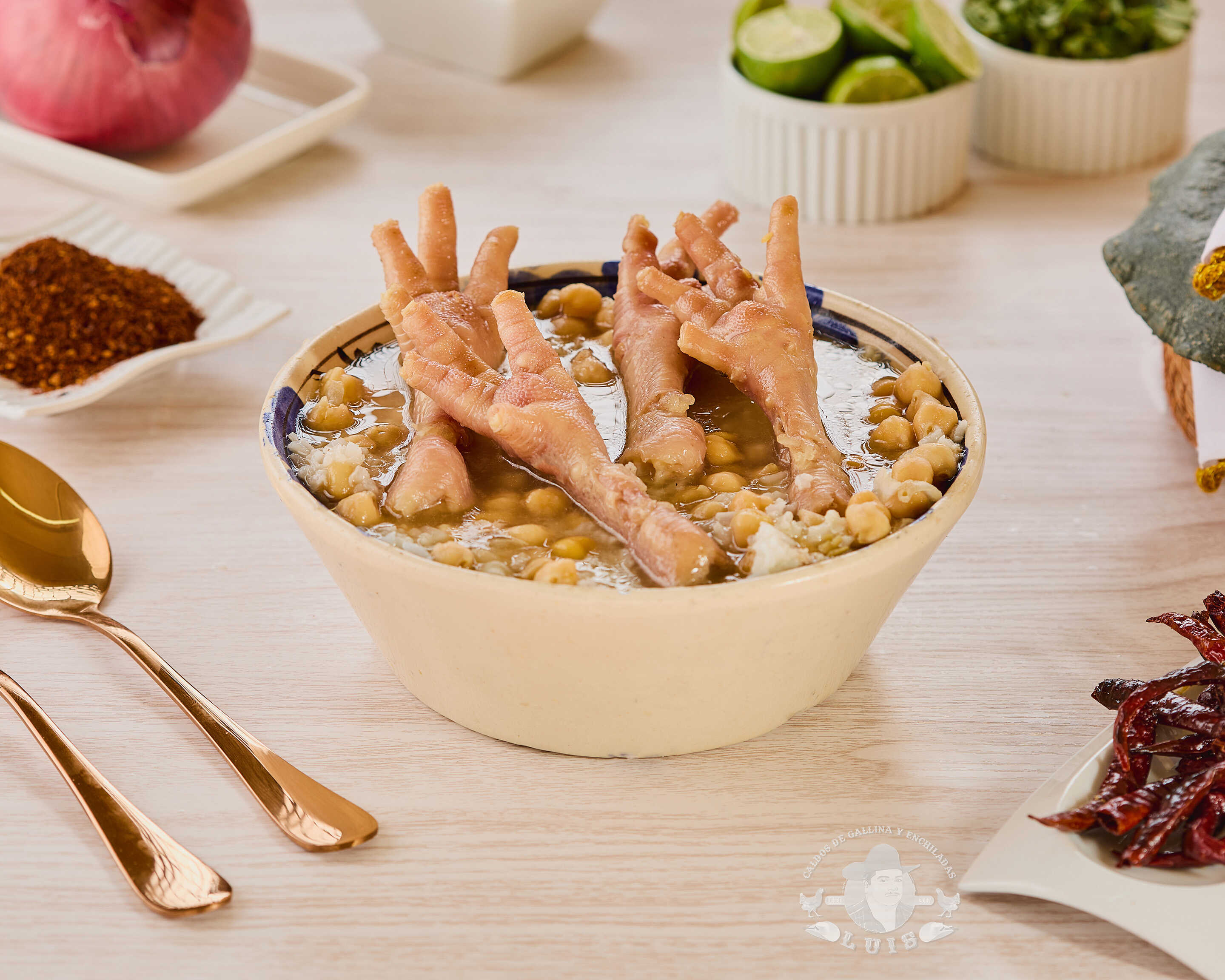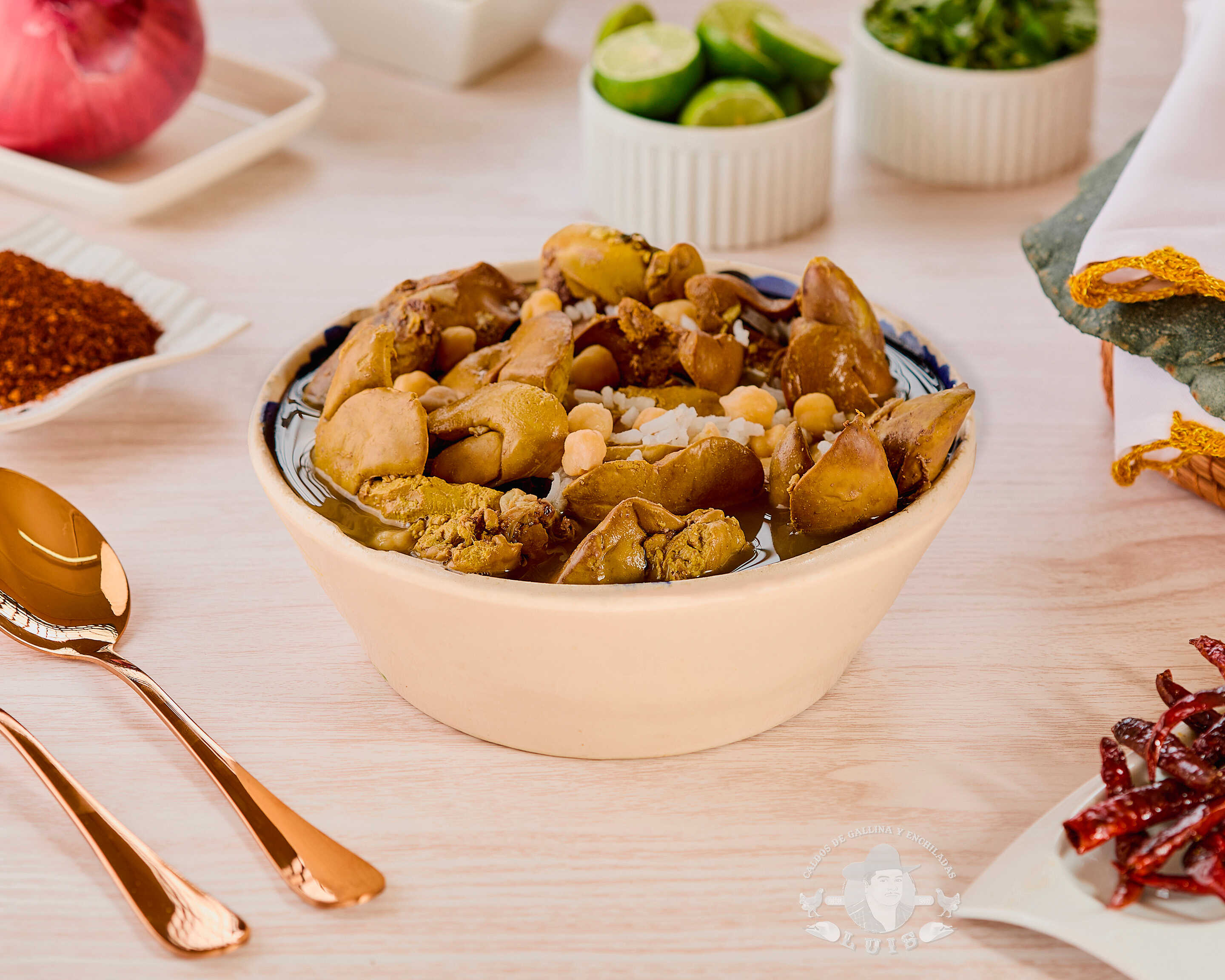 Caldo de gallina con garbanzos, cilantro, cebolla y orden completa de mollejas.