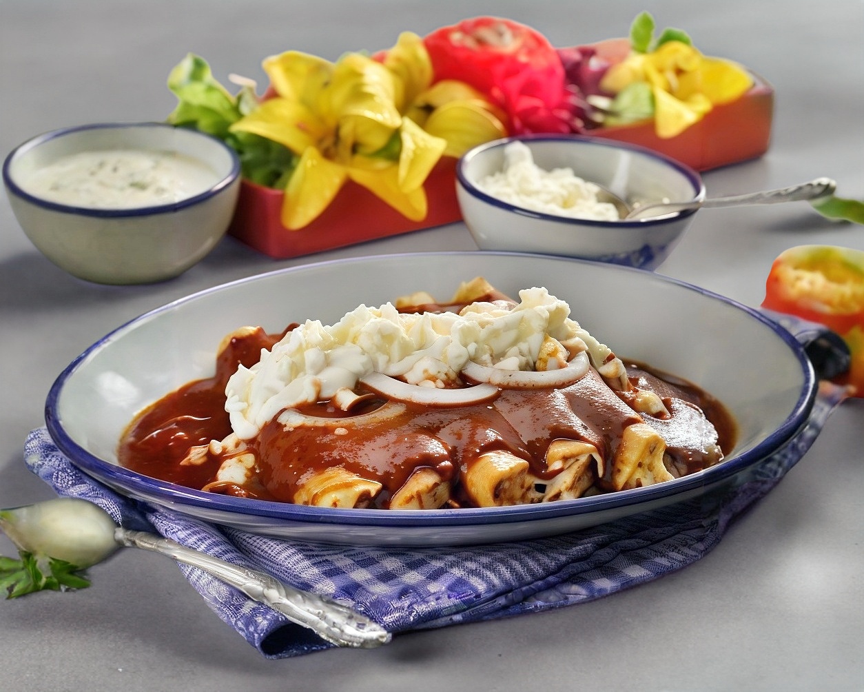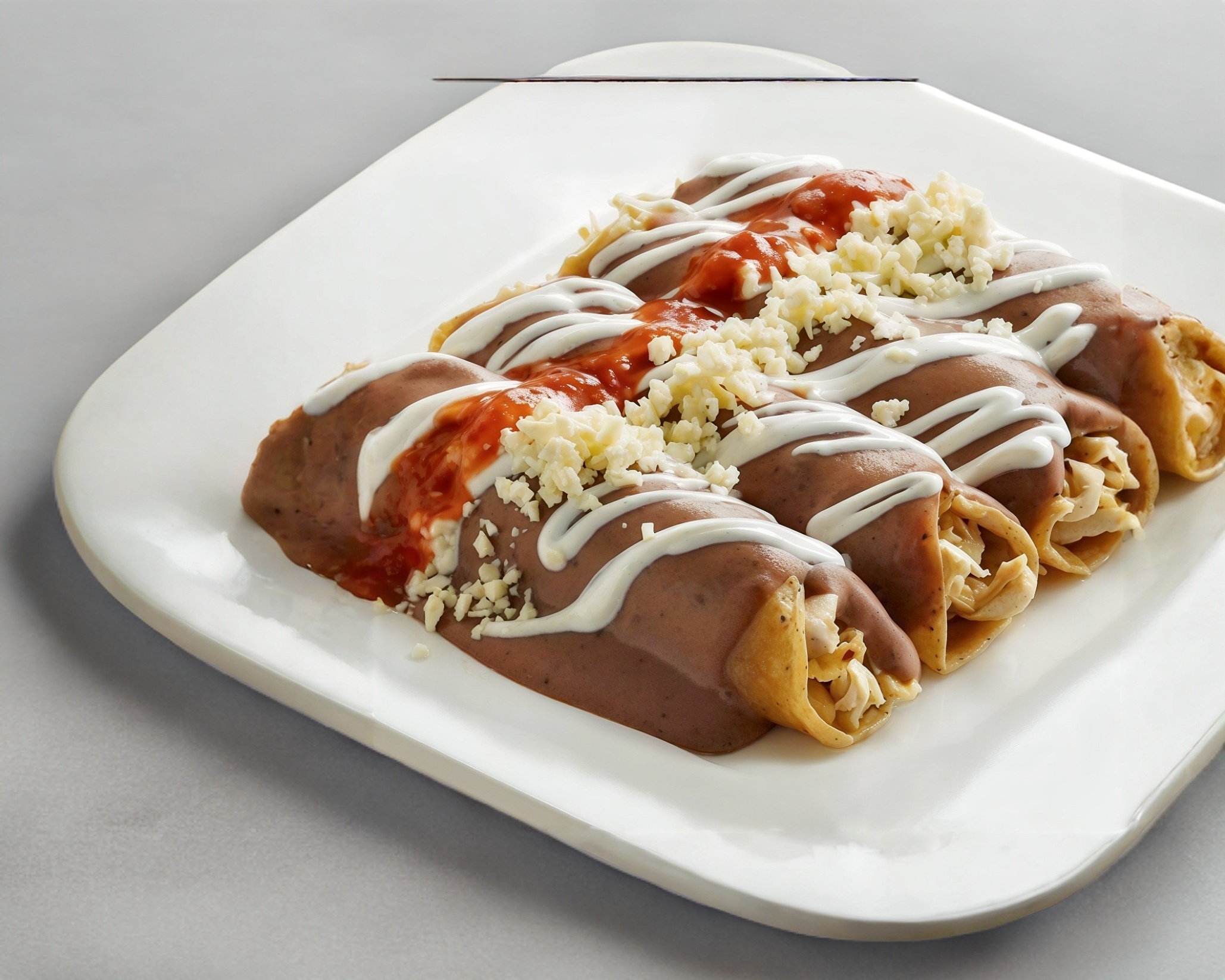 Orden de 4 Enmoladas a elegir con o sin pollo preparadas con crema, queso y cebolla. Incluye Bolillo.