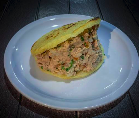 Arepa 90 gr de atún con mayonesa, cebolla, jitomate y cilantro.