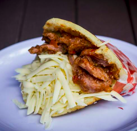 Arepa, 80 gr de carne deshebrada guisada con queso manchego.