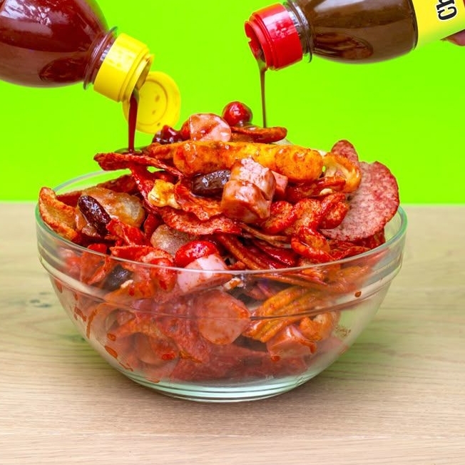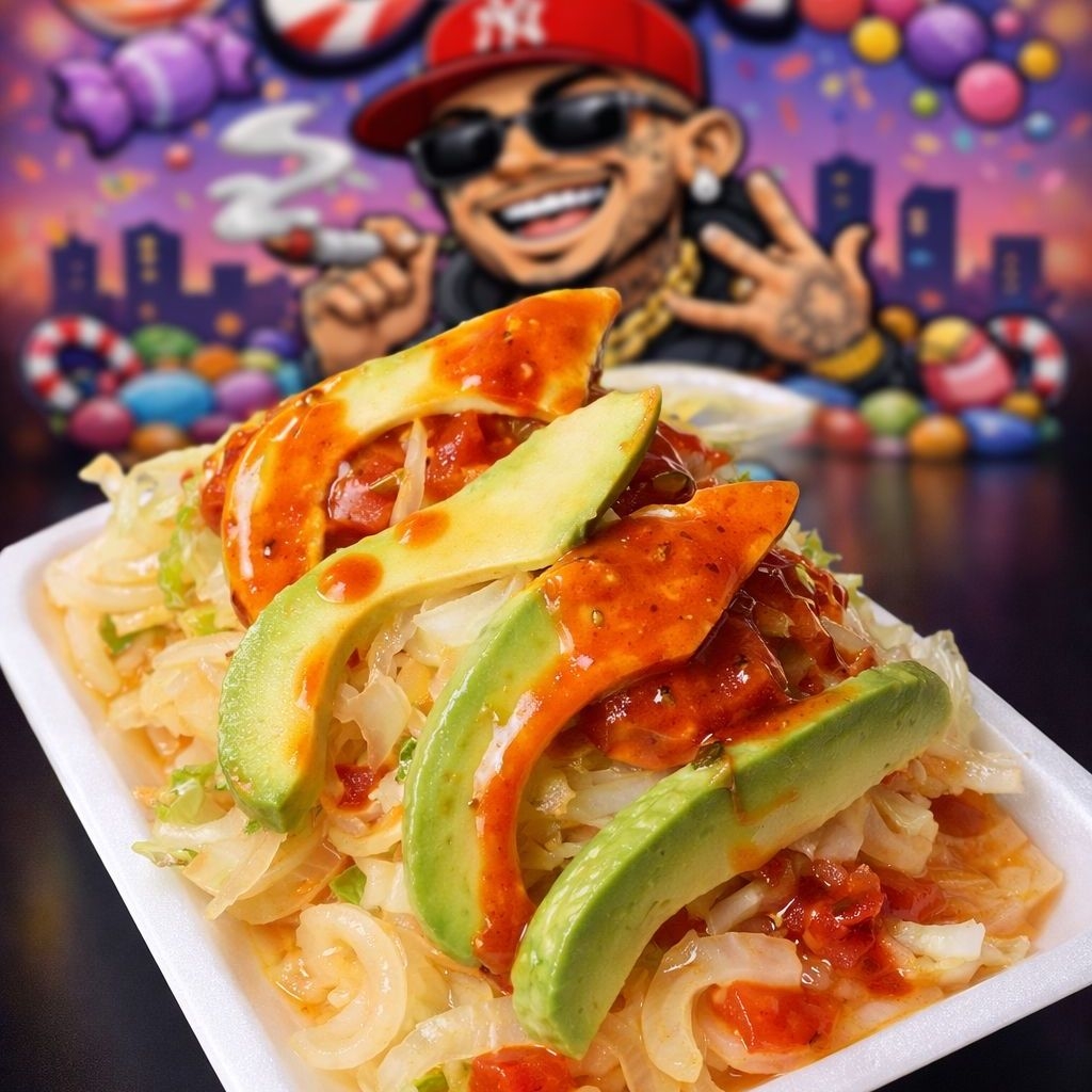 (100gr) De papas del sabor de tu elección,preparadas con lechuga,crema,cueritos,jitomate,aguacate,salsa,chamoy,tajin,miguelito a tú gusto