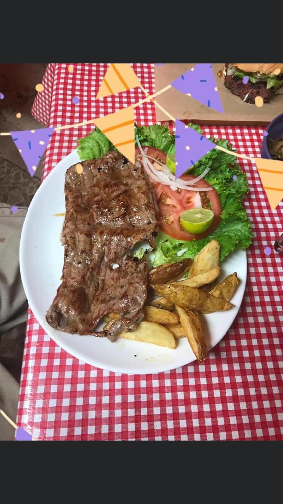 Suculento corte de 250 gr aprox. Acompañado de frijoles charros, papas a la francesa, ensalada, salsa de cacahuate y tortillas