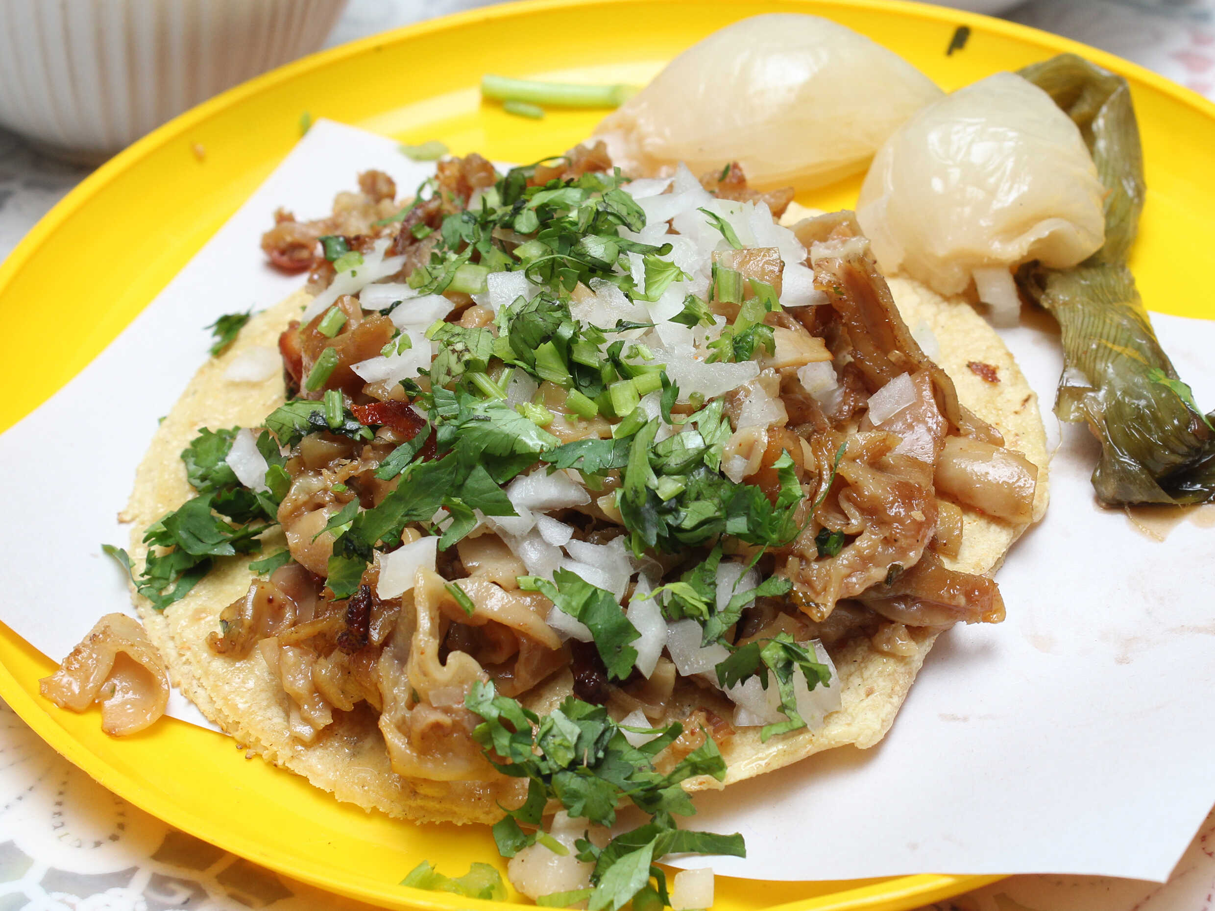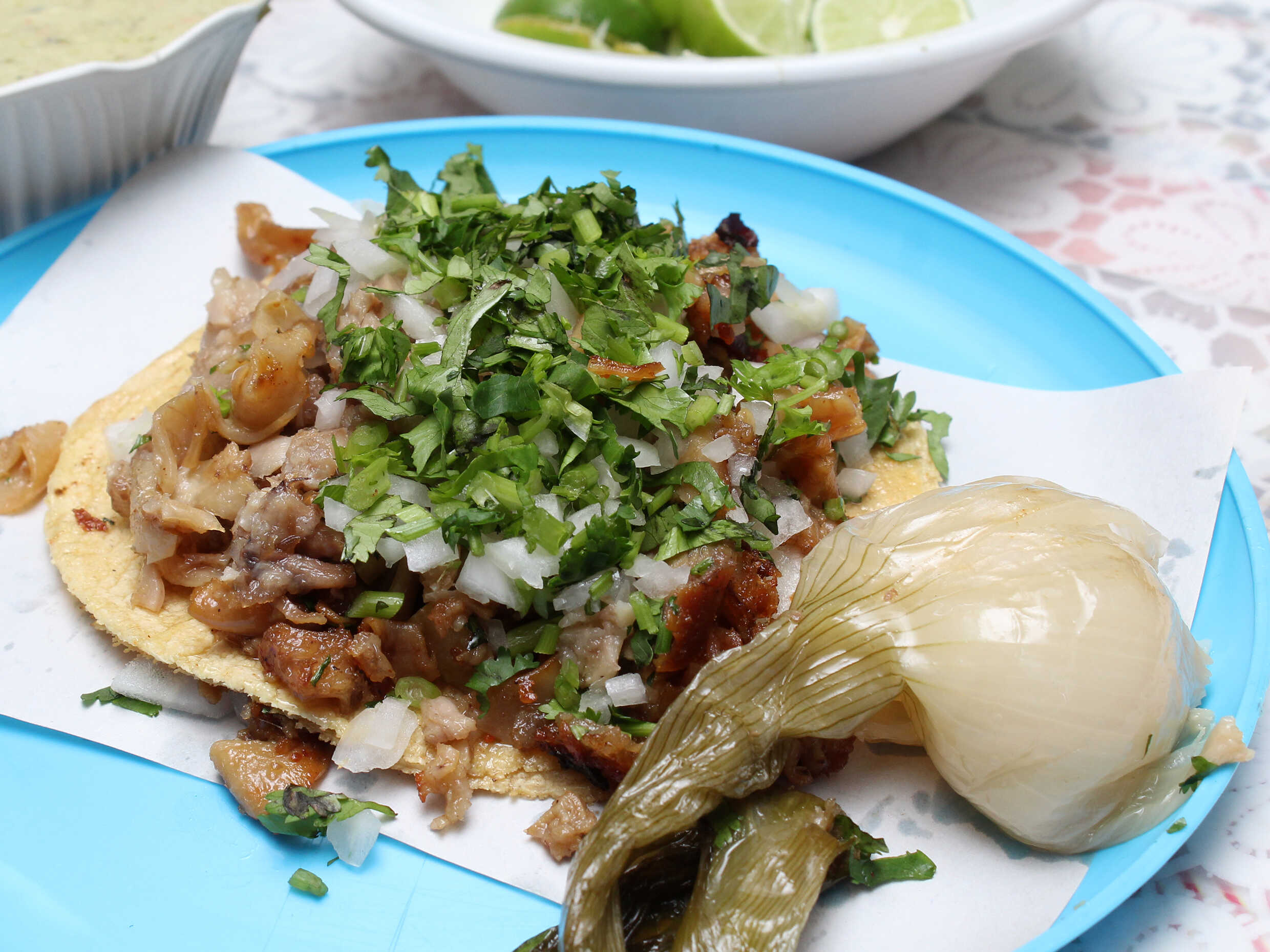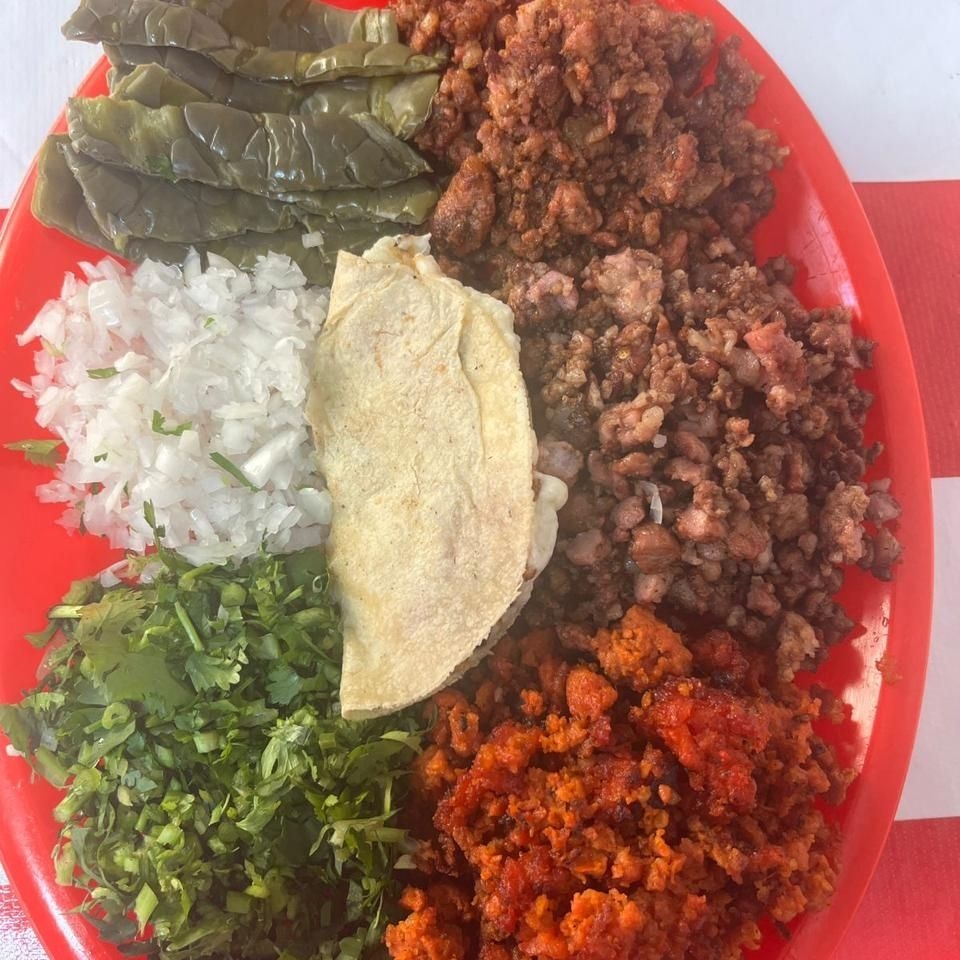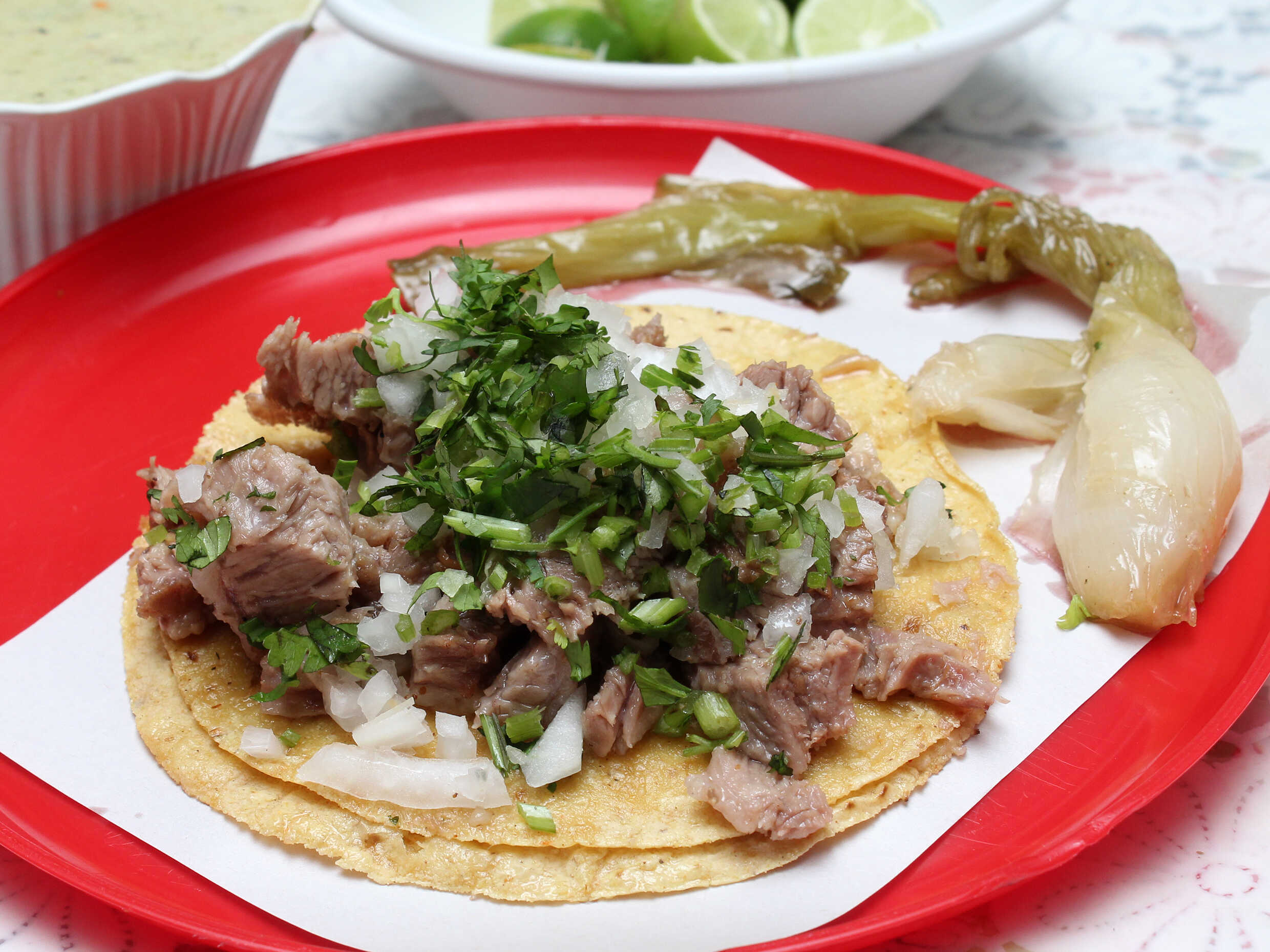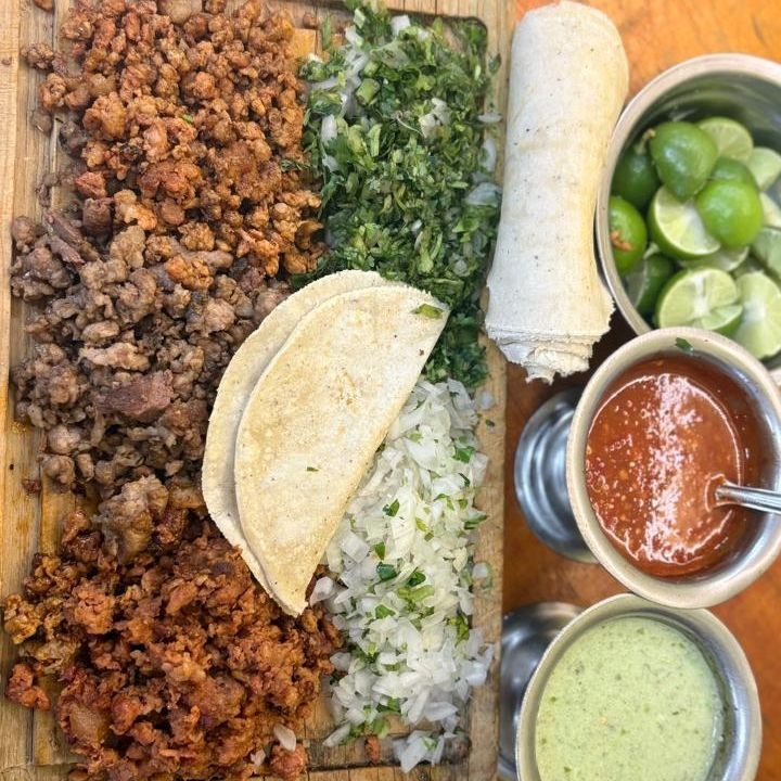 Mix de suadero y tripa en tortilla de maíz con cilantro y cebolla salsa roja y limones.