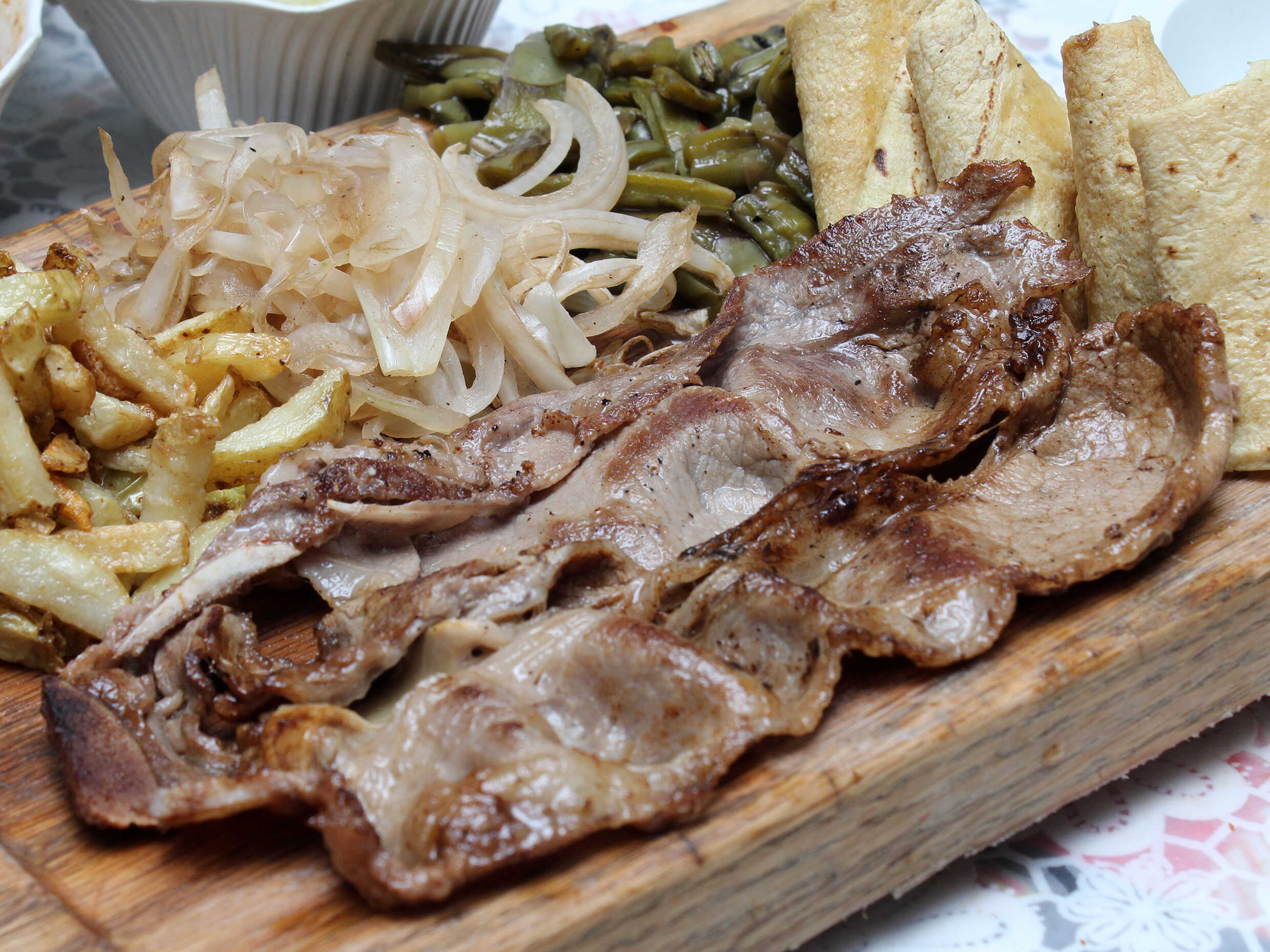 Arrachera marinada servida en tortilla de maíz acompañada de papas a la fancesa,nopalitos y cebolla carameliada.