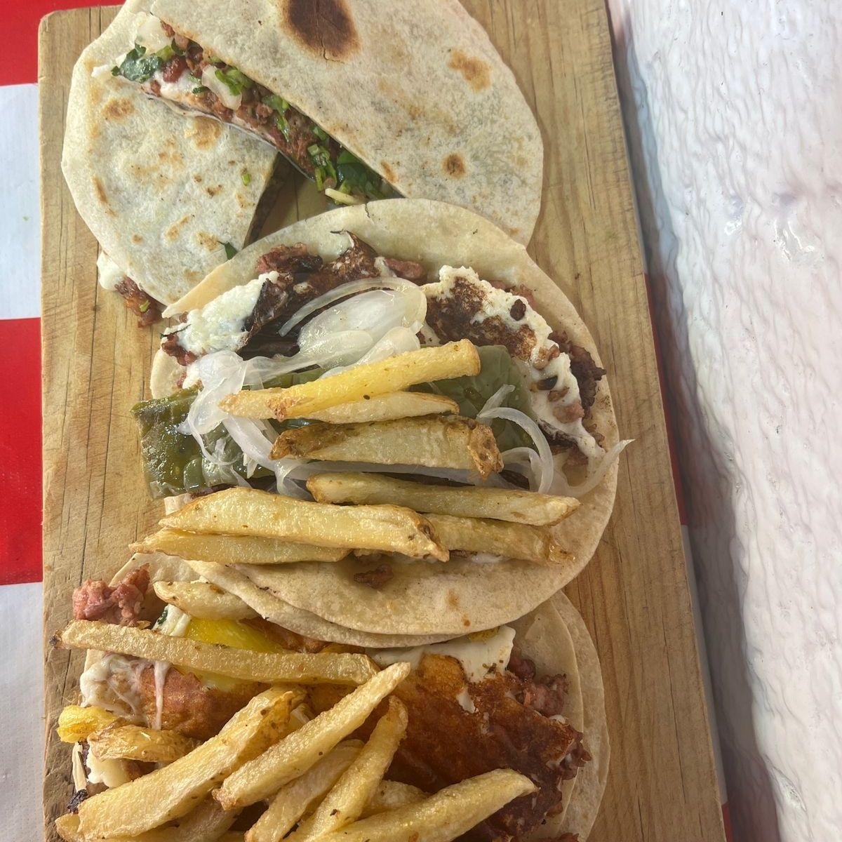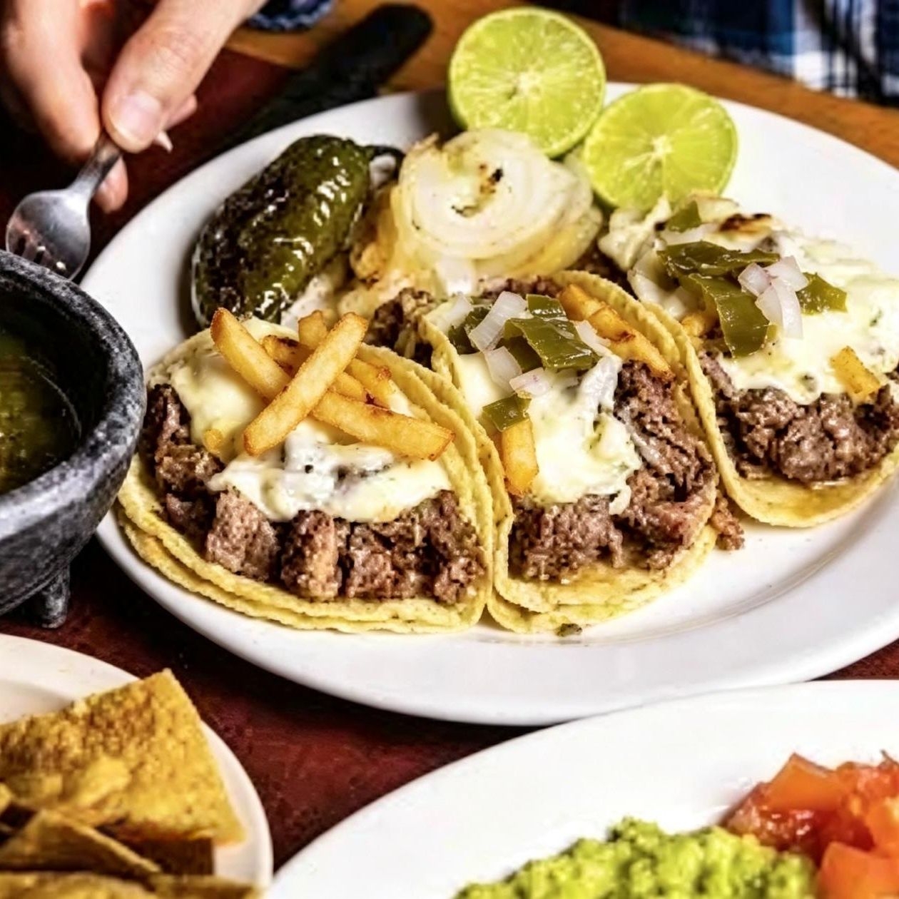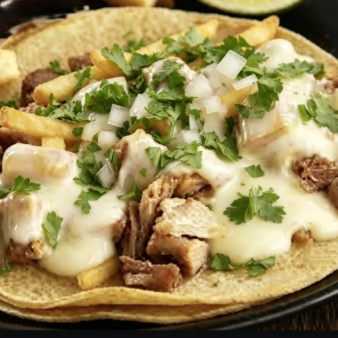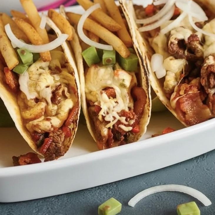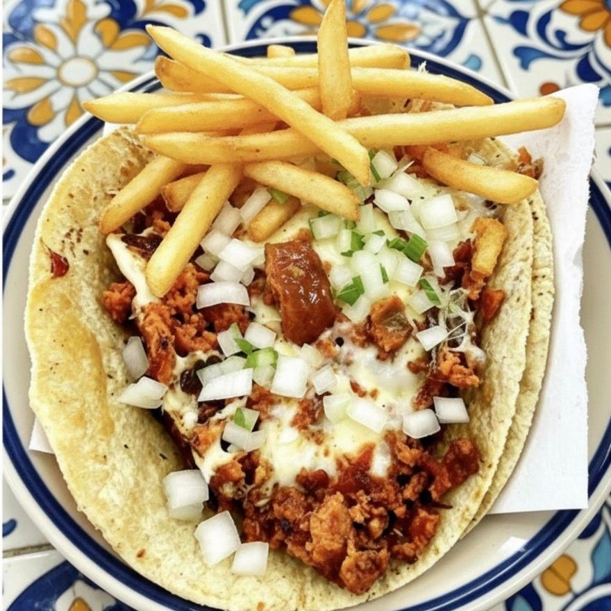 Pastor de trompo con queso Oaxaca en tortilla de maíz tamaño grande con papas a la francesa, cilantro y cebolla salsa roja o guacamole y limones.