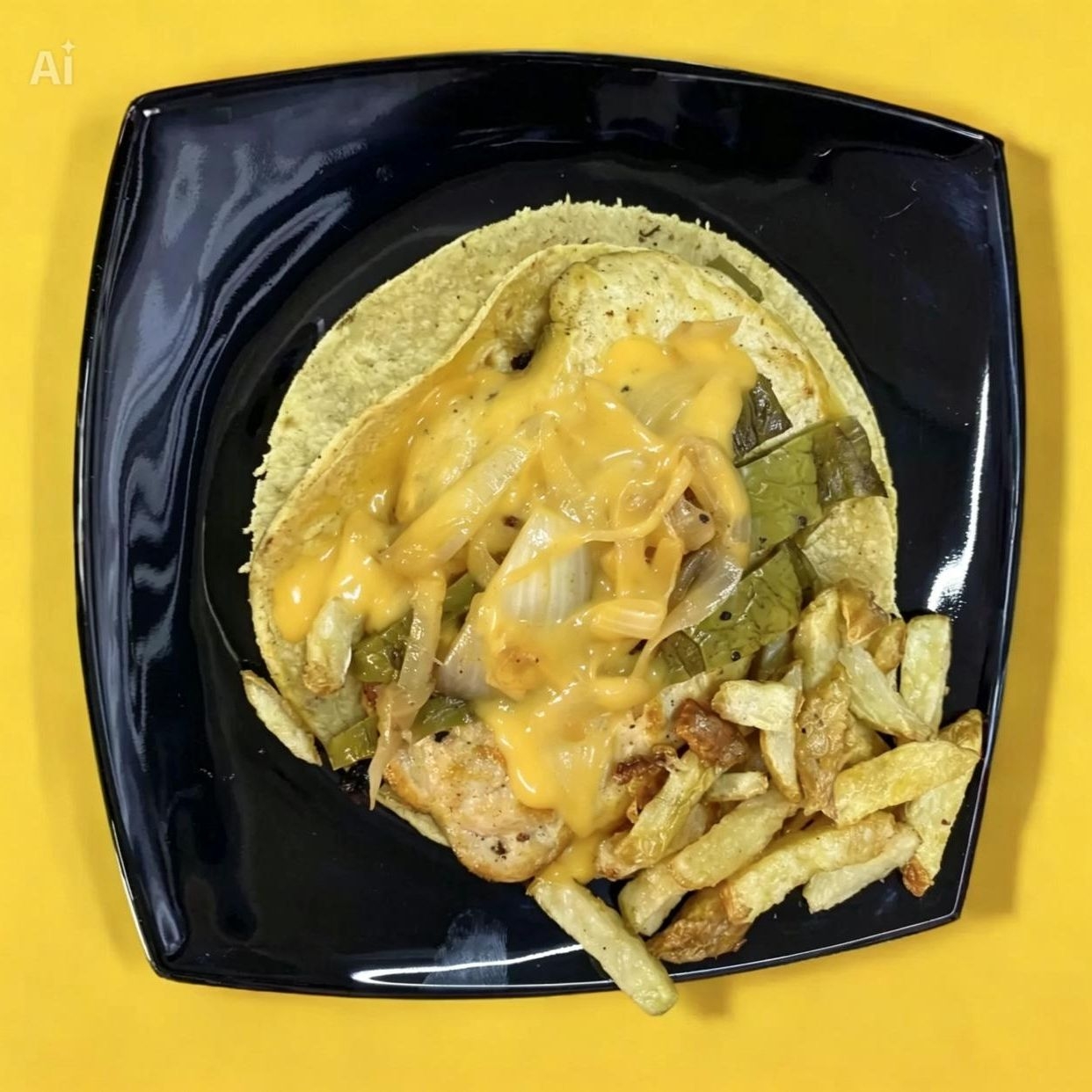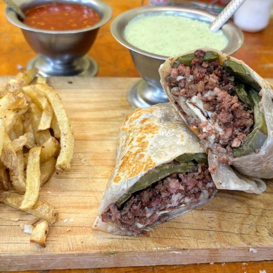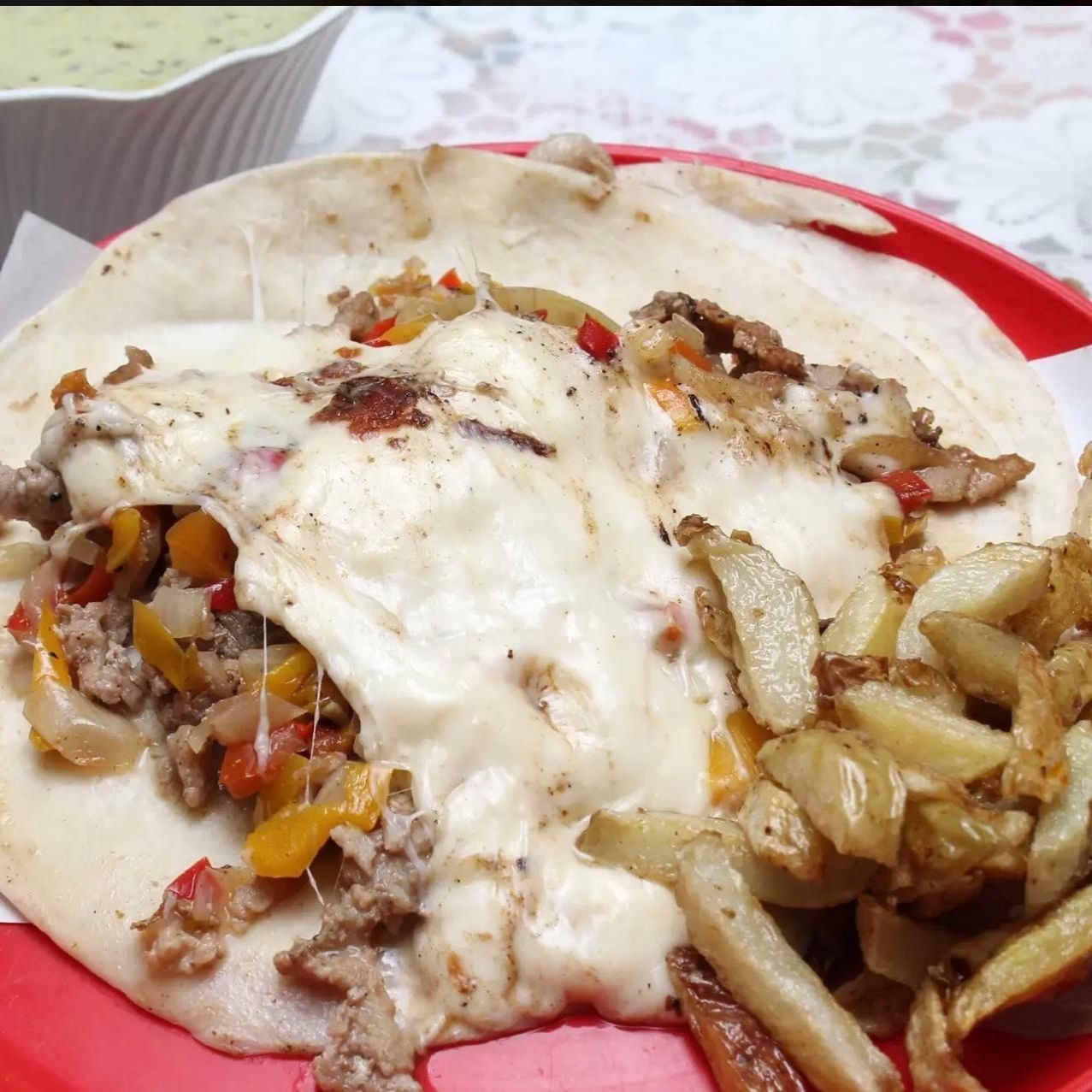 Bisteck con queso, servido en dos tortillas de harina grandes con papas a la francesa, nopalitos y cebolla caramelizada.