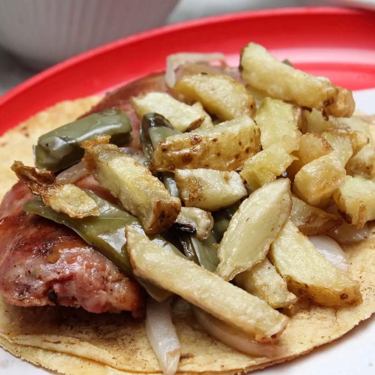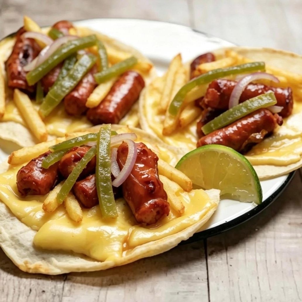 Longaniza con queso en tortilla de maíz tamaño normal con papas a la francesa, nopalitos y cebolla caramelizada guacamole, salsa roja y limones.