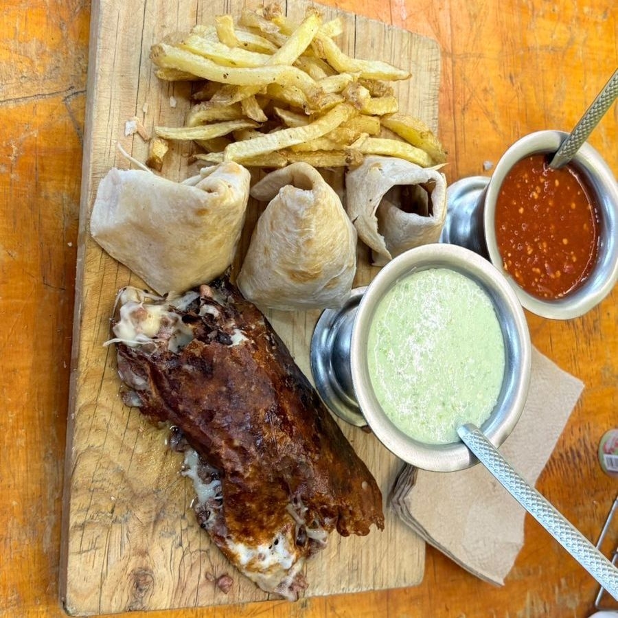Chorizo argentino con queso Oaxaca en tortilla de maíz normal acompañado de papas a la francesa, nopales y cebolla caramelizada con guacamole o salsa roja y limones.