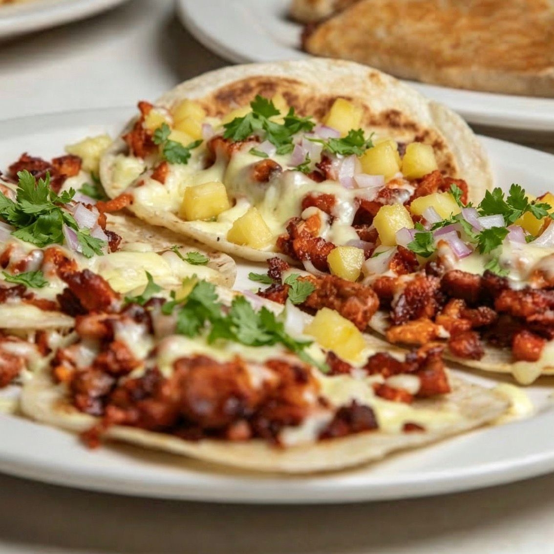 Delicioso pastor de trompo en tortilla de maiz acompañado de cilantro, cebolla y piña con guacamole o salsa roja y limones.