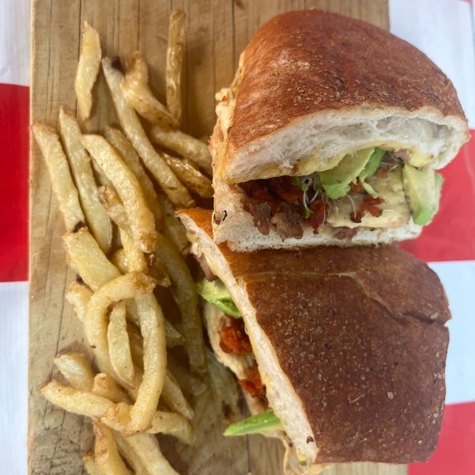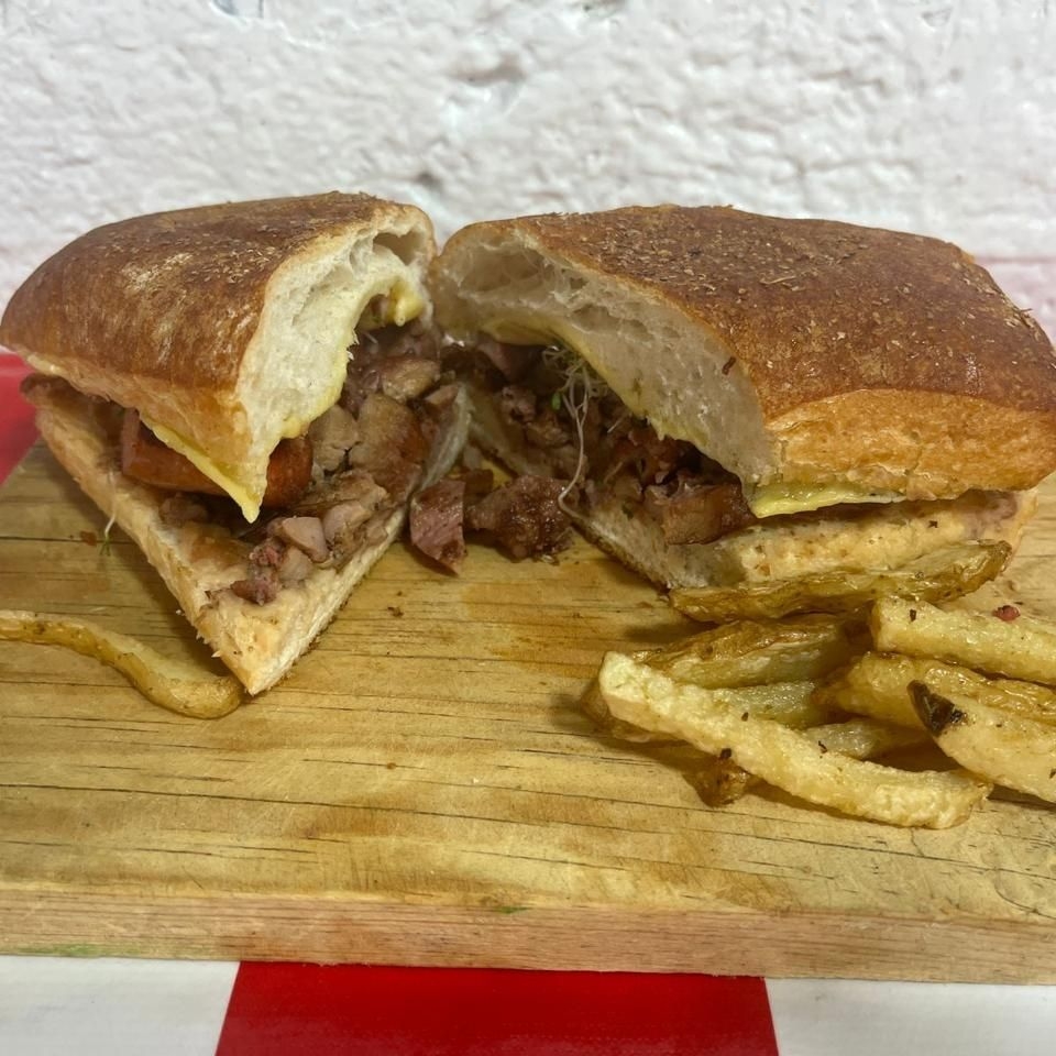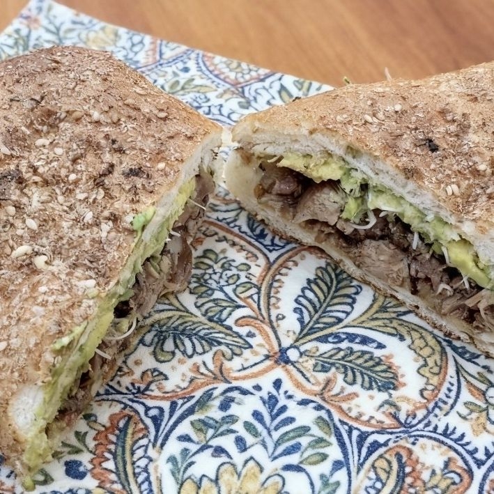 Chapata rellena de ARRACHERA CHISTORRA Y QUESO con cebolla, aguacate y germen de trigo