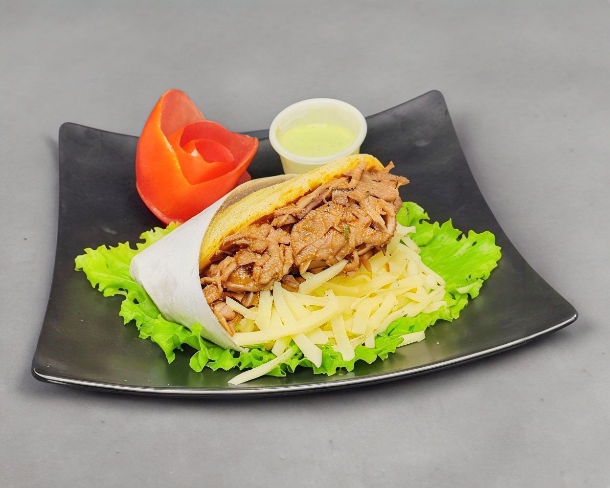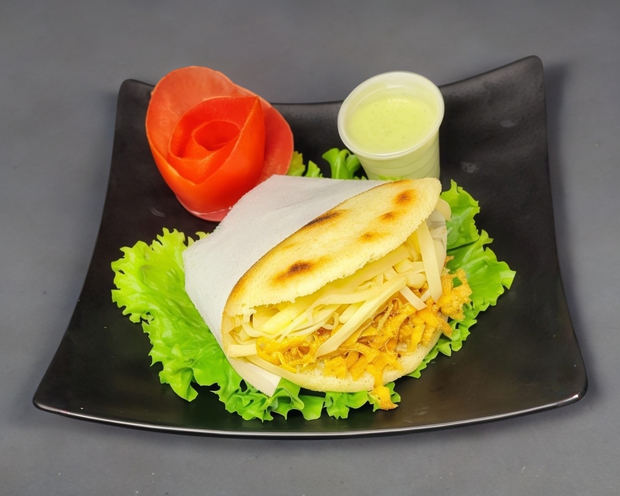 Arepa asada hecha con harina de maíz sin gluten, rellena con carne deshebrada de res y queso manchego rayado. Relleno de 100 gr.