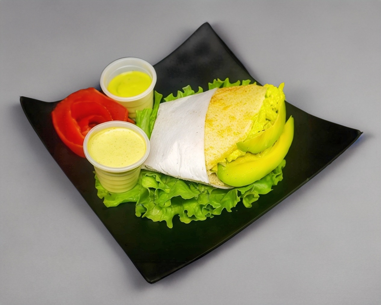 Arepa asada hecha con harina de maíz sin gluten, rellena con pollo deshebrado, aguacate, sal y un toque de mayonesa.