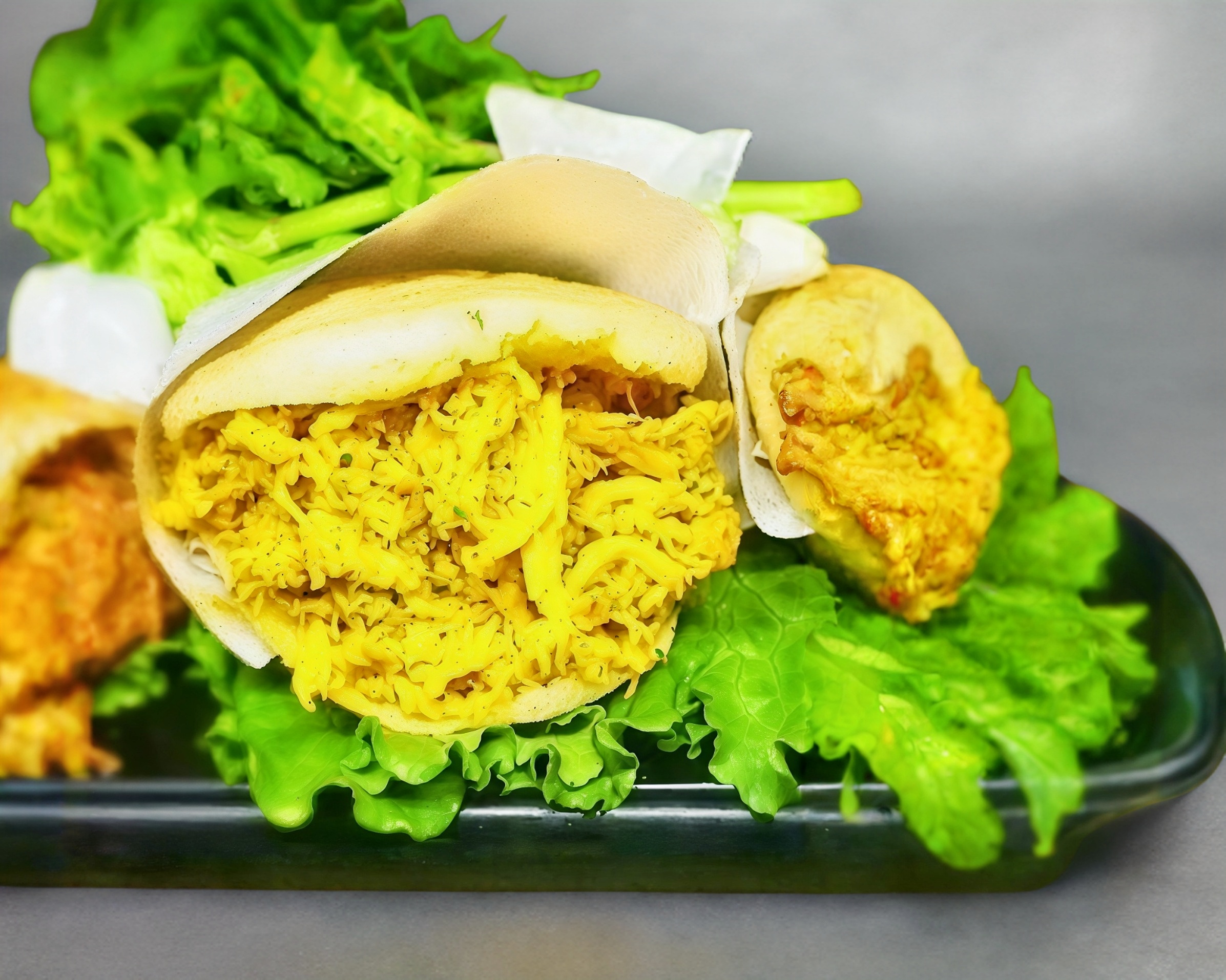 Arepa asada hecha con harina de maíz sin gluten, rellena de pollo deshebrado guisado con sabor caribeño.