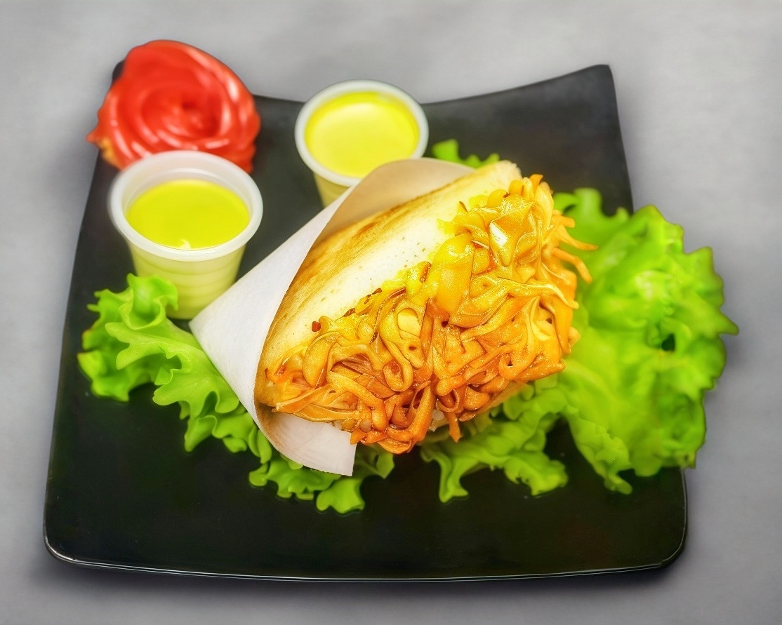 Empanada frita hecha con harina de maíz, rellena de variedad de mariscos como pulpo, camarones y calamares