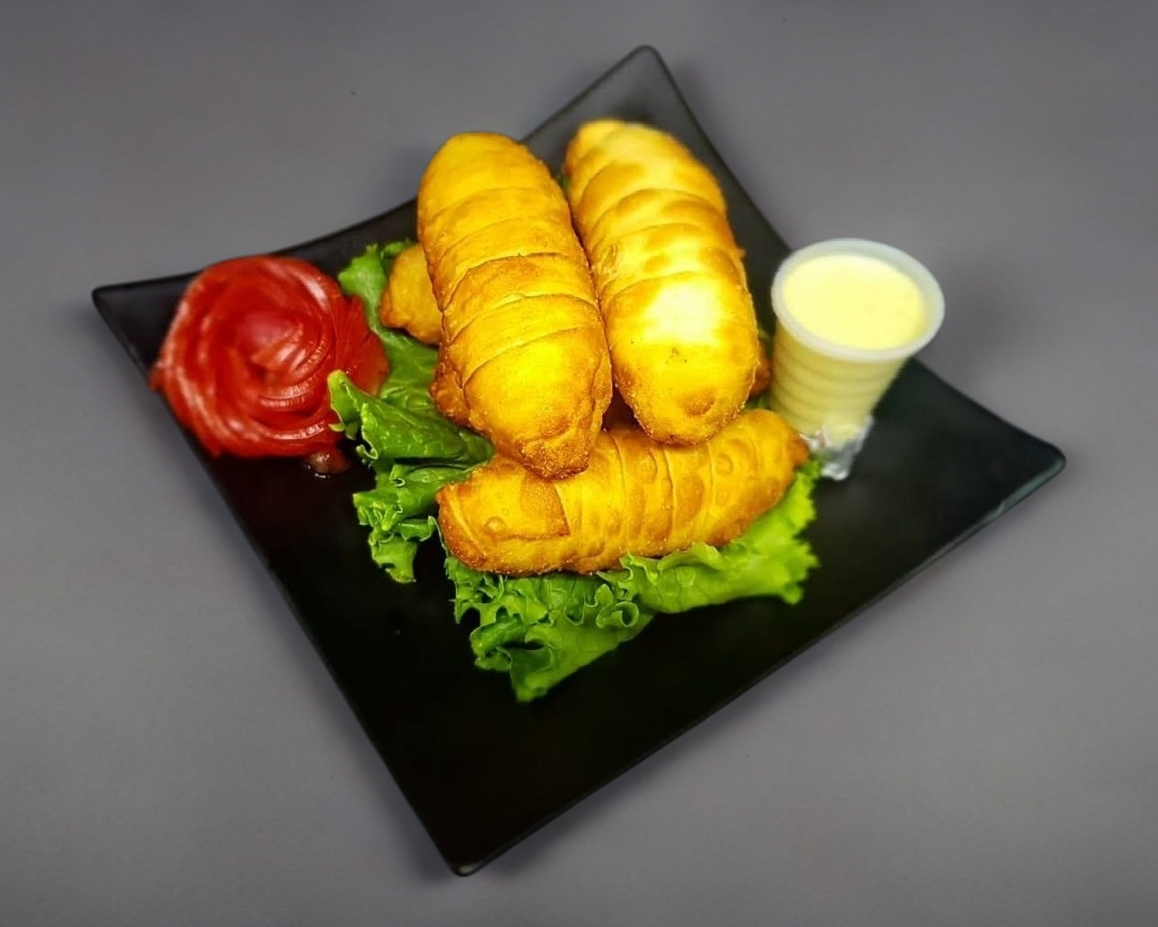 Tequeño relleno de queso y plátano macho frito. incluye 5 piezas.