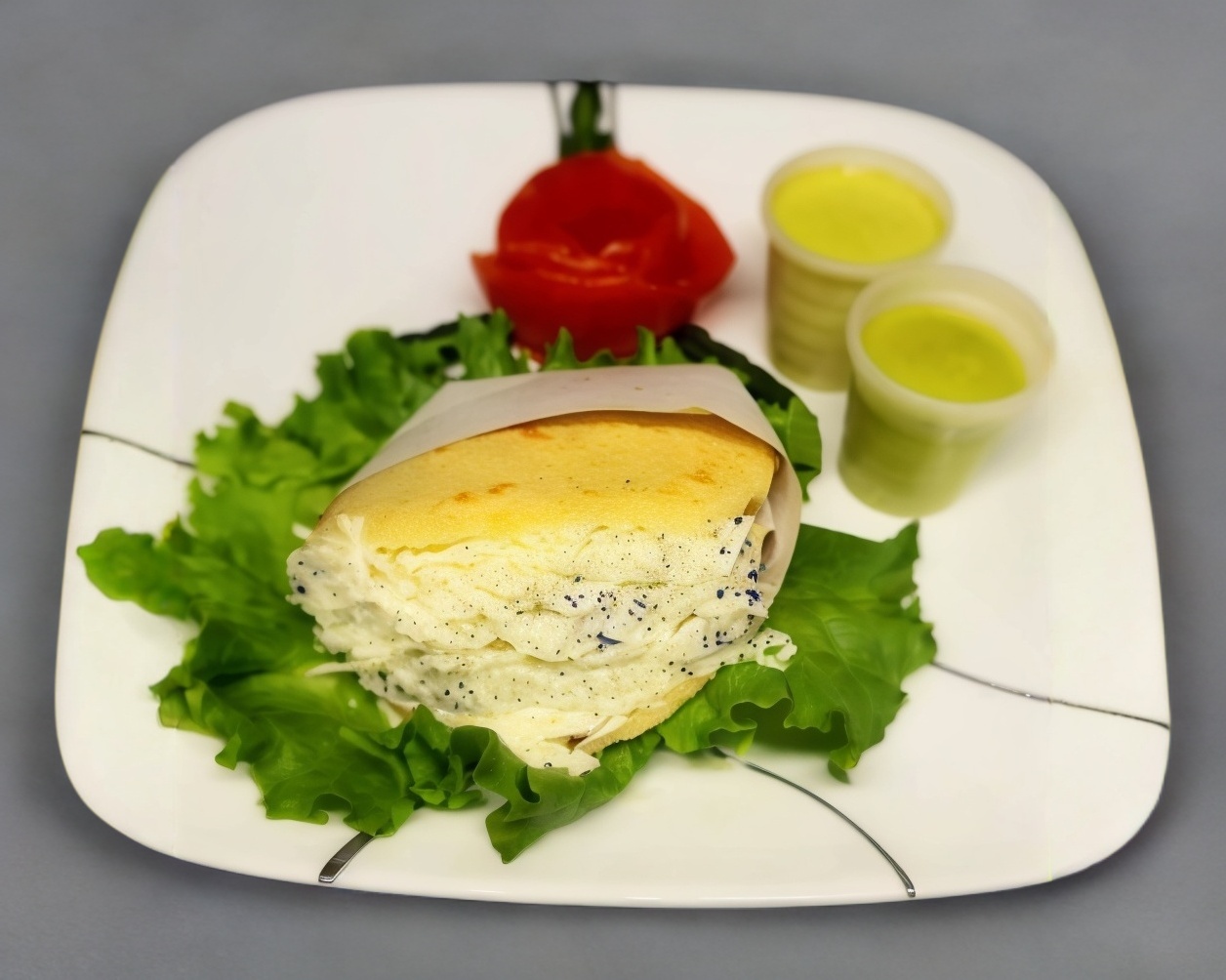 Arepa asada hecha con harina de maíz sin gluten, rellena con pollo deshebrado, aguacate, mayonesa y queso manchego.