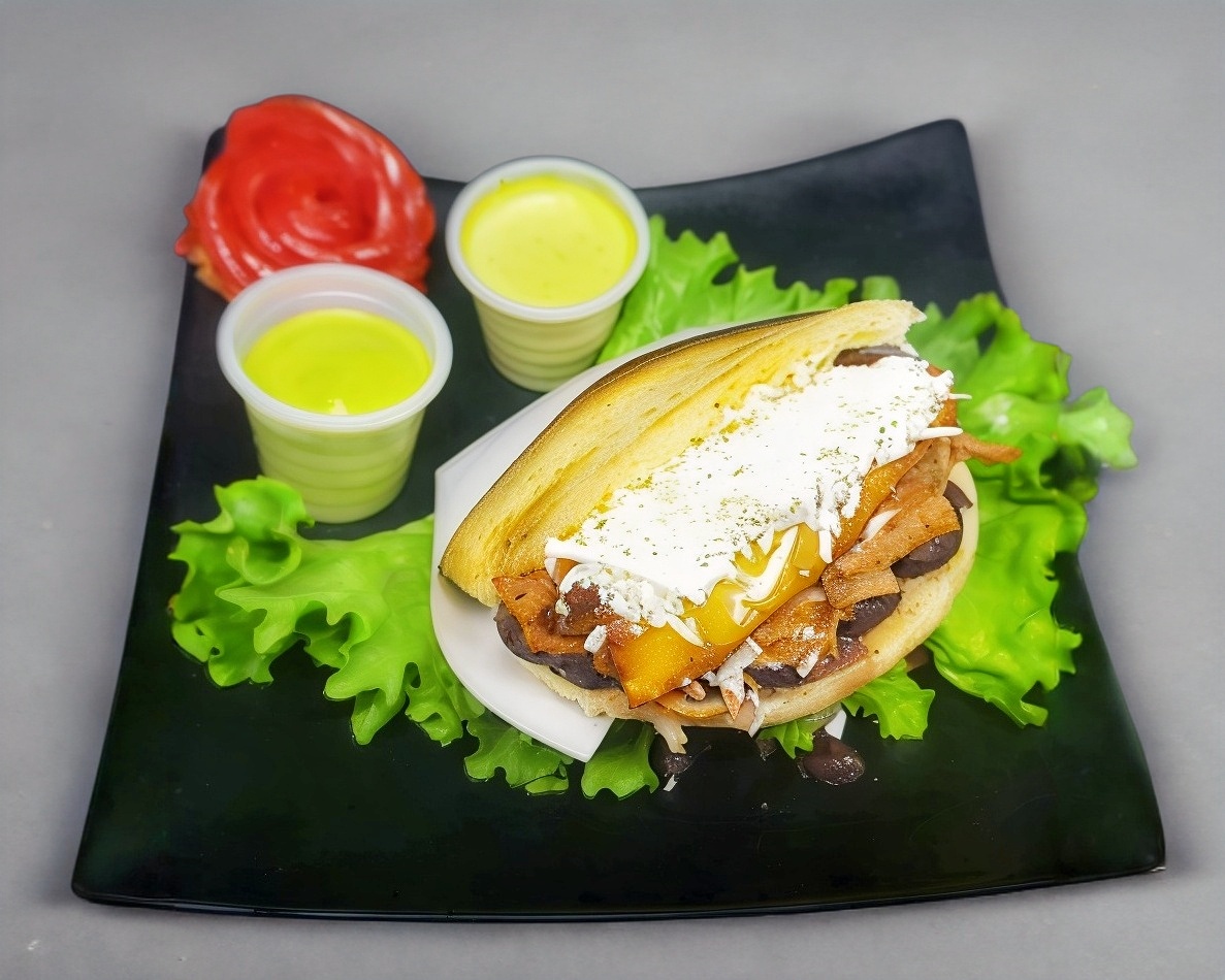 Arepa asada hecha con harina de maíz sin gluten, rellena de carne deshebrada, plátano macho frito, frijoles negros y queso cotija.