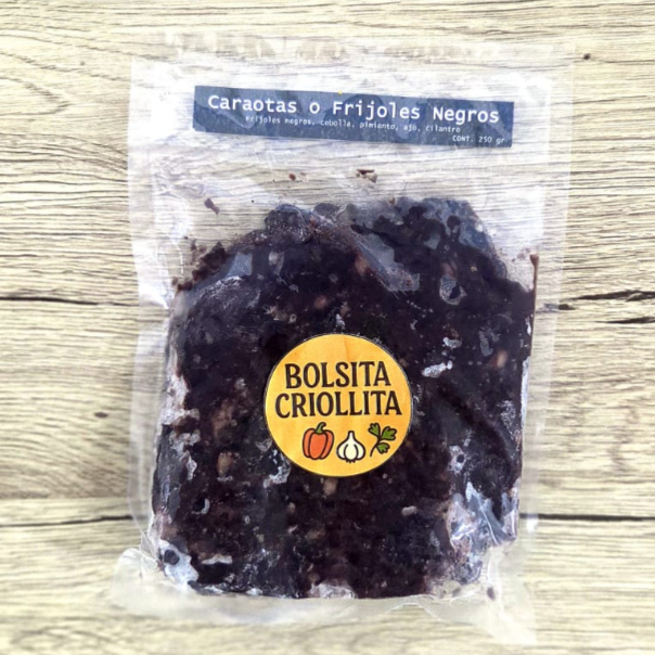 Paquete congelado listo para calentar y servir de caraotas (frijoles negros), contiene cebolla, pimiento, ajo, cilantro.