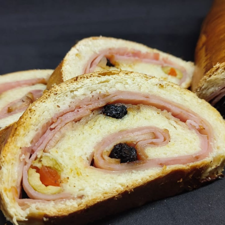 Pastelito venezolano hecho con harina de trigo, relleno de chuleta ahumada y queso manchego.