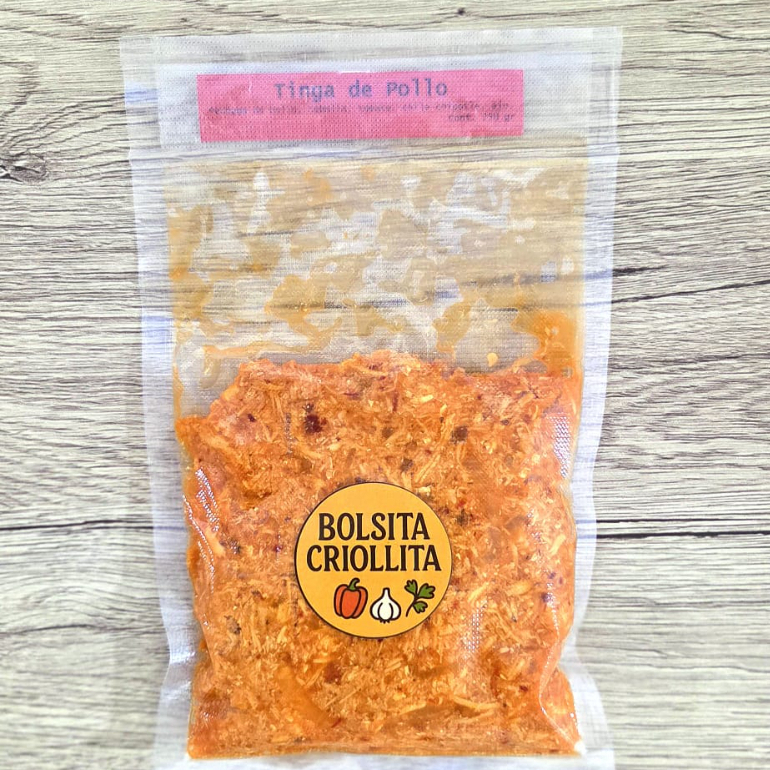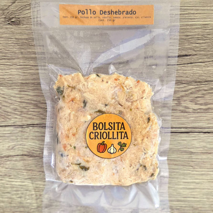 Paquete congelado listo para calentar y servir de pechuga de pollo deshebrado, contiene tomate, cebolla, pimiento, ajo, cilantro.
