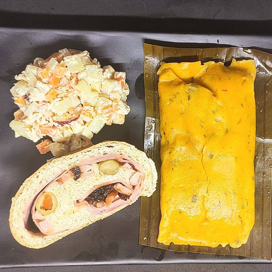 Plato típico navideño venezolano. Incluye 1 hallaca, 1 ensalada navideña, 1 de trozo de pan de jamón venezolano
