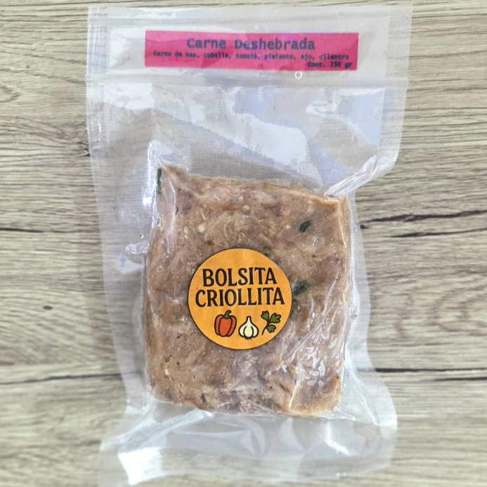 Paquete congelado listo para calentar y servir de carne de res deshebrada, contiene tomate, cebolla, pimiento, ajo, cilantro.