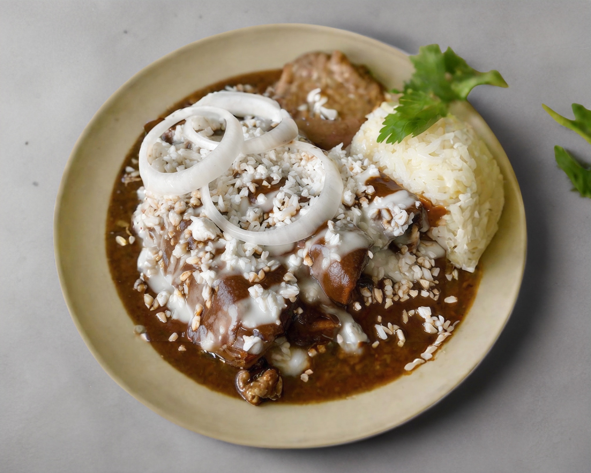 Acompañadas de arroz, frijoles, crema, queso, cebolla y pan
