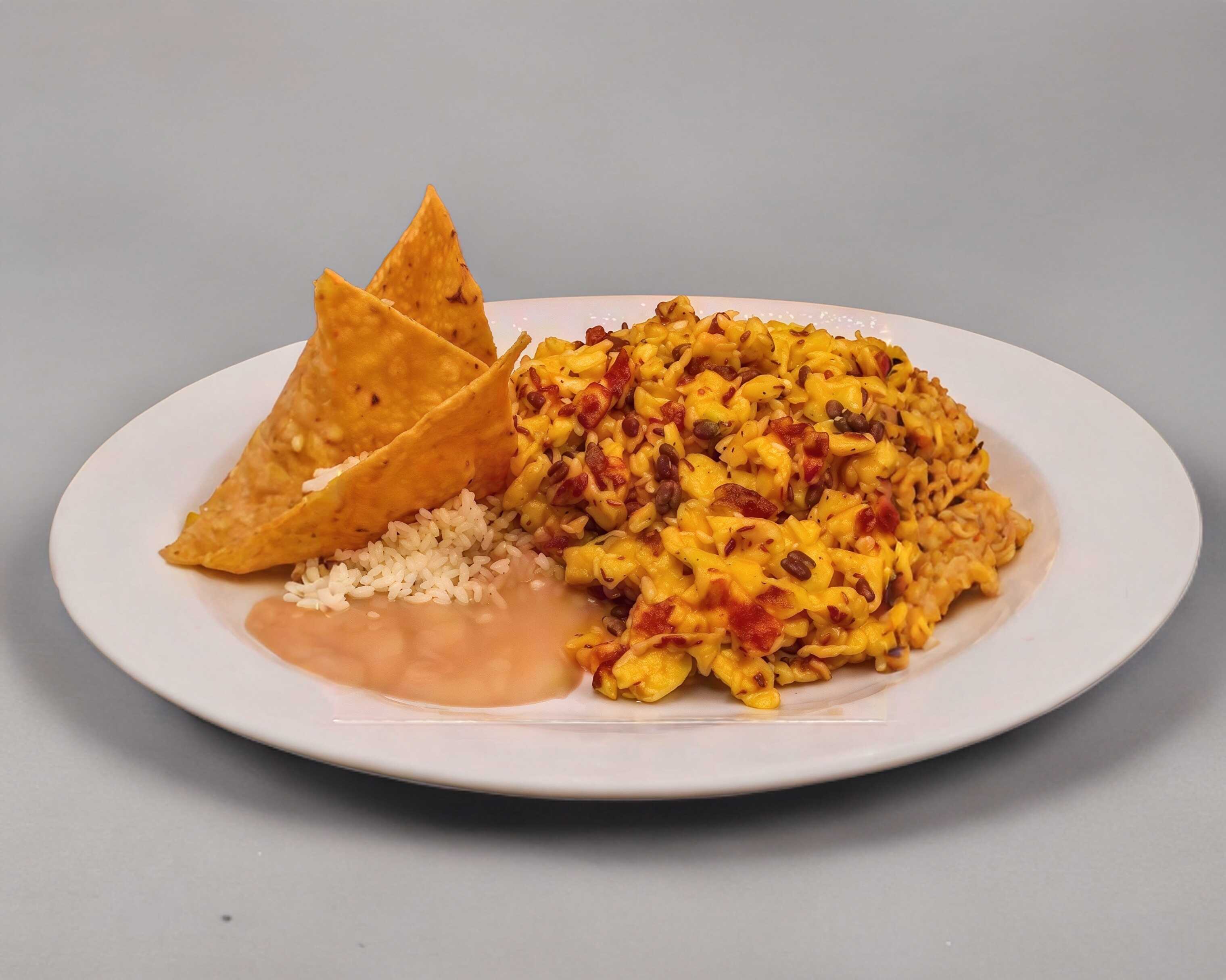 Con chilaquiles, incluye pan, arroz y frijoles refritos.