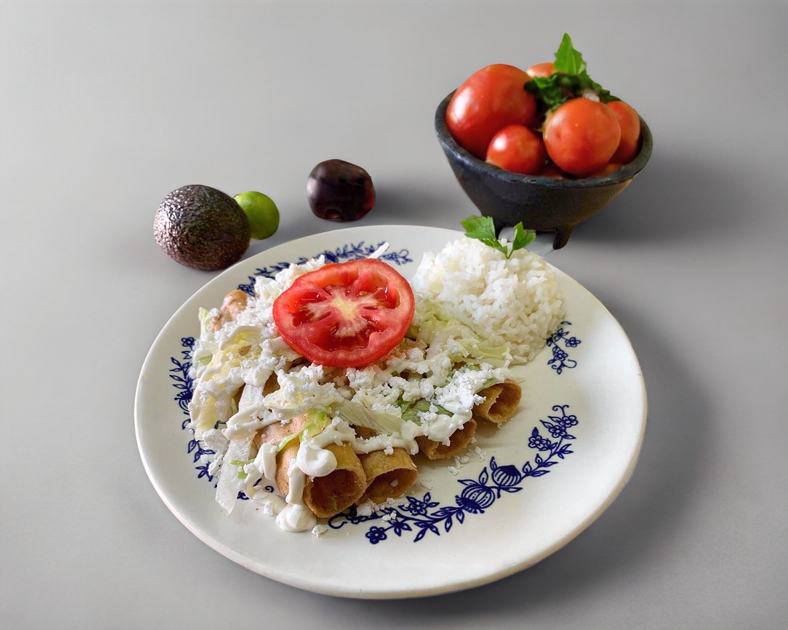 Tacos dorados de pollo, arroz y frijoles.