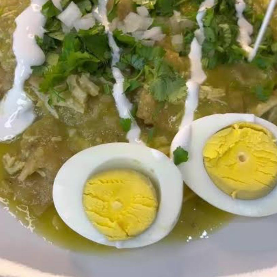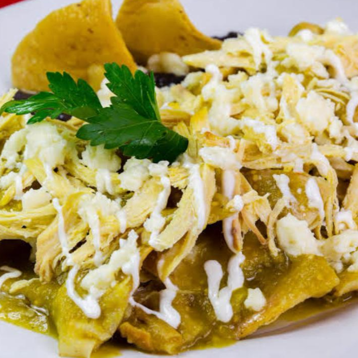 Totopos en salsa verde, pollo, lechuga, crema, queso, huevo cocido, cebolla, cilantro, Incluyen arroz y frijoles. Gratis un refresco de 355ml al azar.