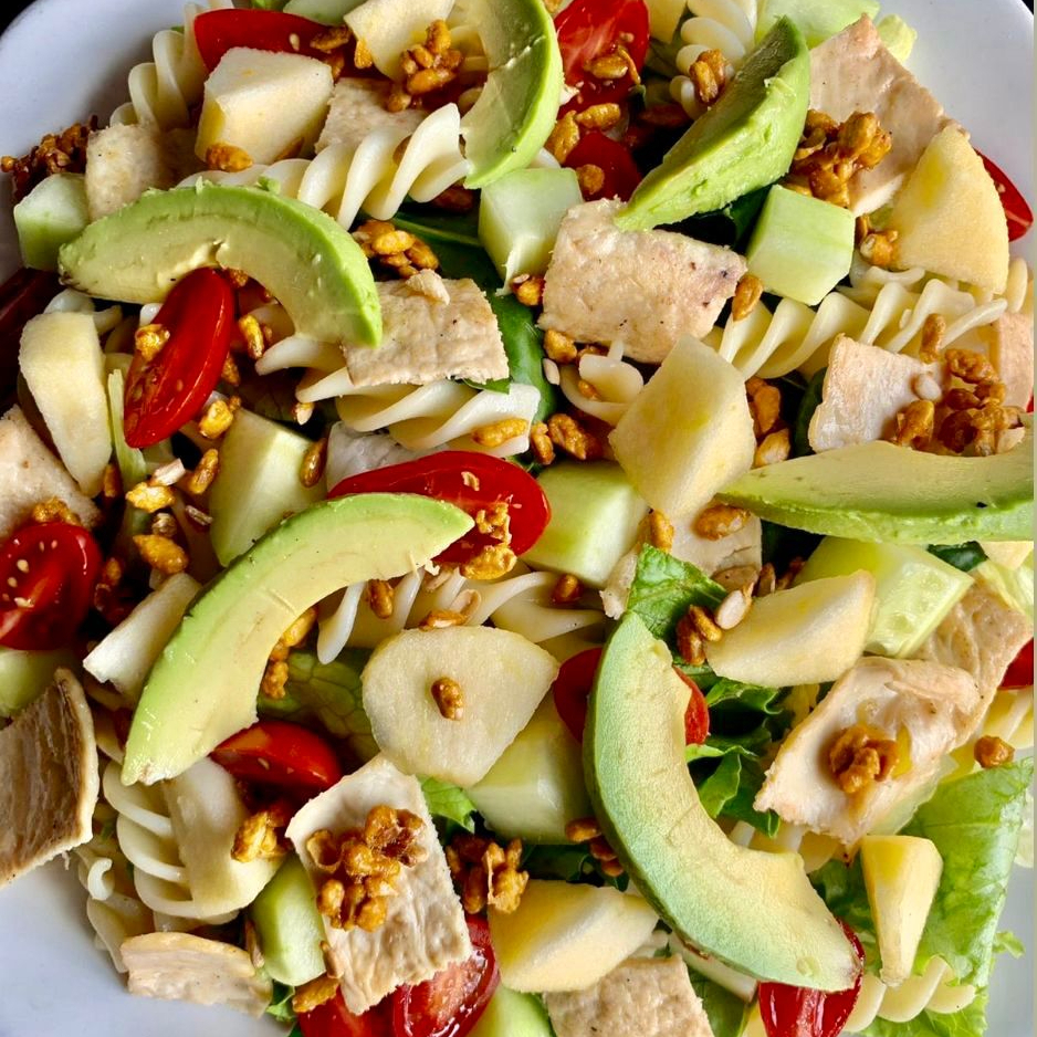 Base de lechugas, pechuga, pepino, manzana, pasta, jitomate y aguacate.