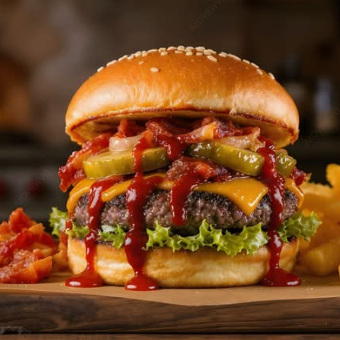 150 g De carne de res smash en pan brioche, mayonesa de la casa, jitomate, lechuga, cebolla morada, queso tipo americano y pepinillos caseros.