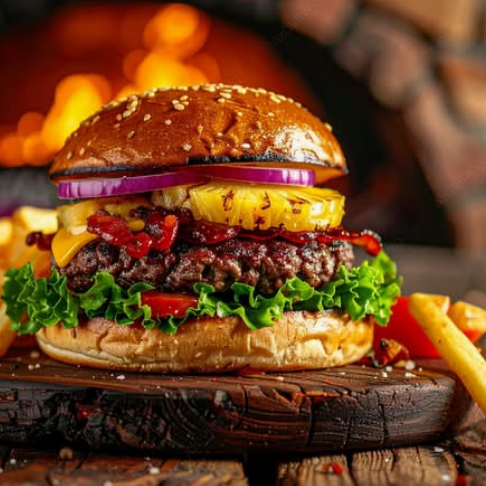 150 g De carne de res smash en pan brioche, mayonesa de la casa, jitomate, lechuga, cebolla morada, queso tipo americano, piña a la plancha y mermelada de tocino.