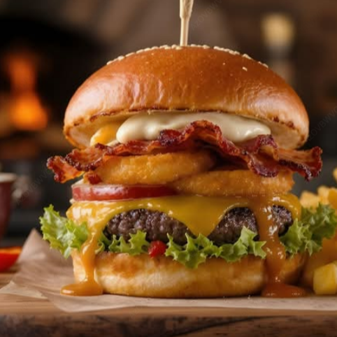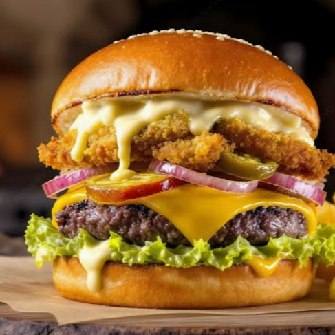150 g De carne de res smash en pan brioche, tocino crujiente, aros de cebolla, salsa bbq, mayonesa de la casa, chiles toreados y queso tipo suizo.