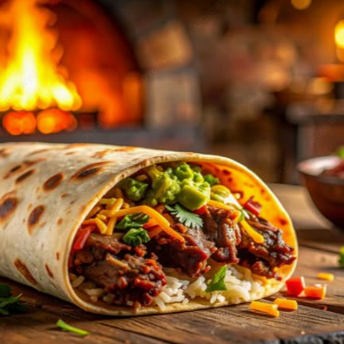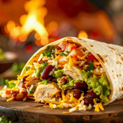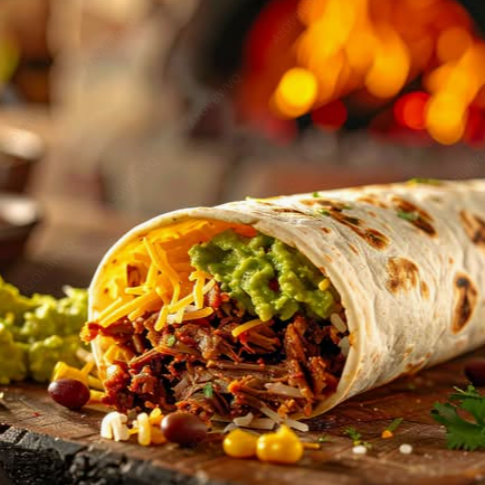 Tortilla de harina gigante, queso, arroz, guacamole y frijol.