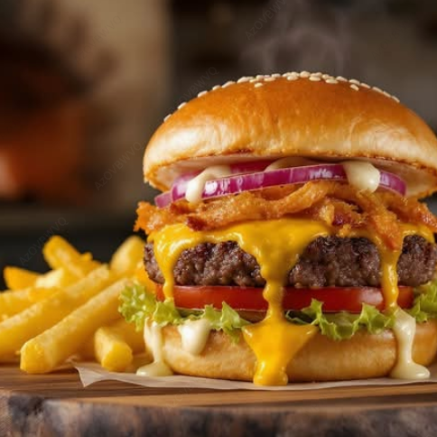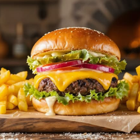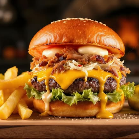 150 g De carne de res smash en pan brioche, 3 quesos, mayonesa de la casa, jitomate, lechuga, cebolla crispy y salsa box.