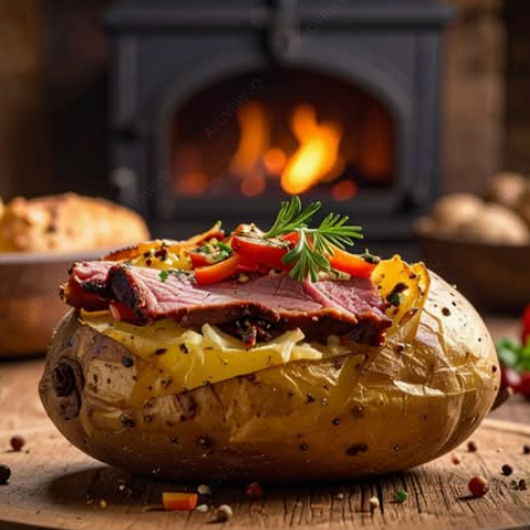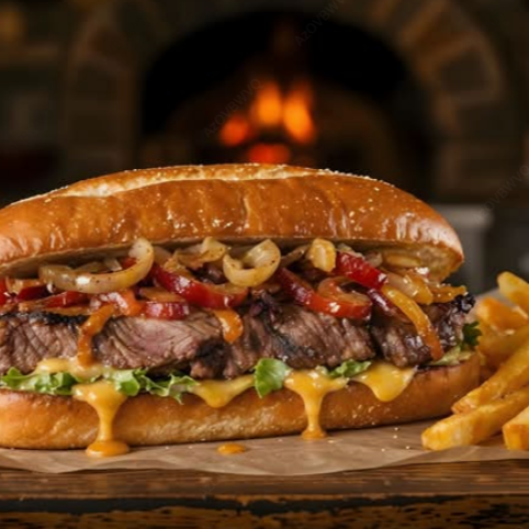 El clásico italiano con finas láminas de carne ahumada en su jugo, 150 g, con cebolla caramelizada, pimientos dulces y queso, incluye papas.