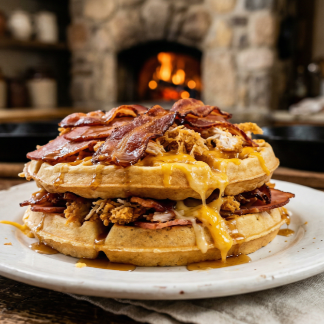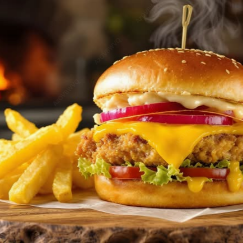 150 g De pollo crispy en pan brioche, mayonesa de la casa, miel mostaza, queso Chihuahua, jitomate, lechuga, cebolla morada y salsa box.