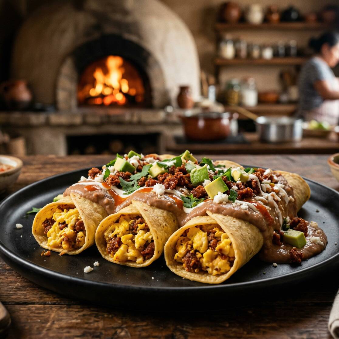 Acompañados de frijoles, crema, queso fresco, cilantro, cebolla y aguacate.