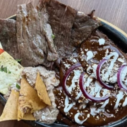 Cecina de res (150 grs.) acompañadas con dobladitas bañadas en mole, frijoles refritos y queso asado