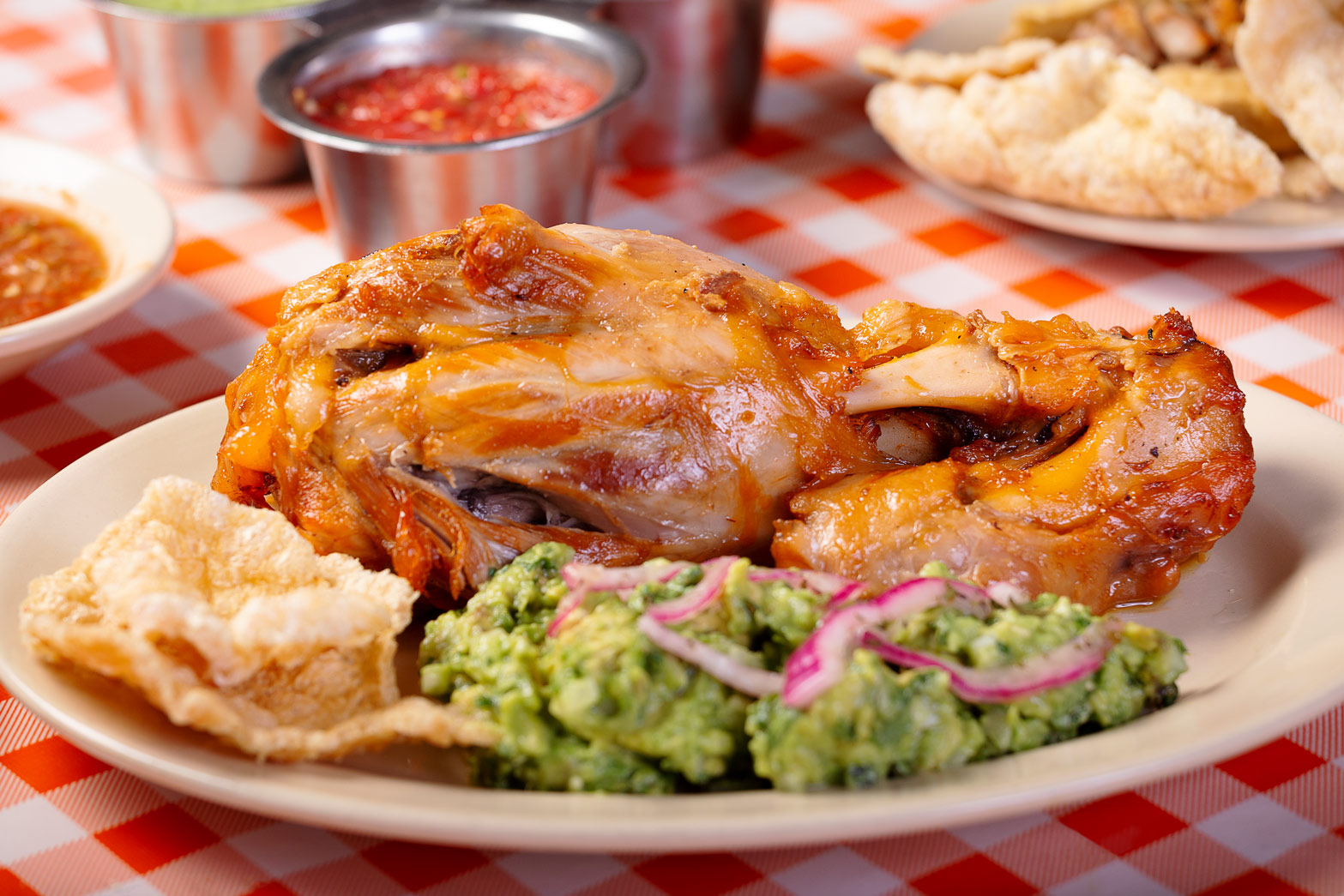 Chamorro con frijoles y guacamole, proporcional de salsa a elegir, proporcional de (cebolla y cilantro o cebolla morada) y proporcional de limones.