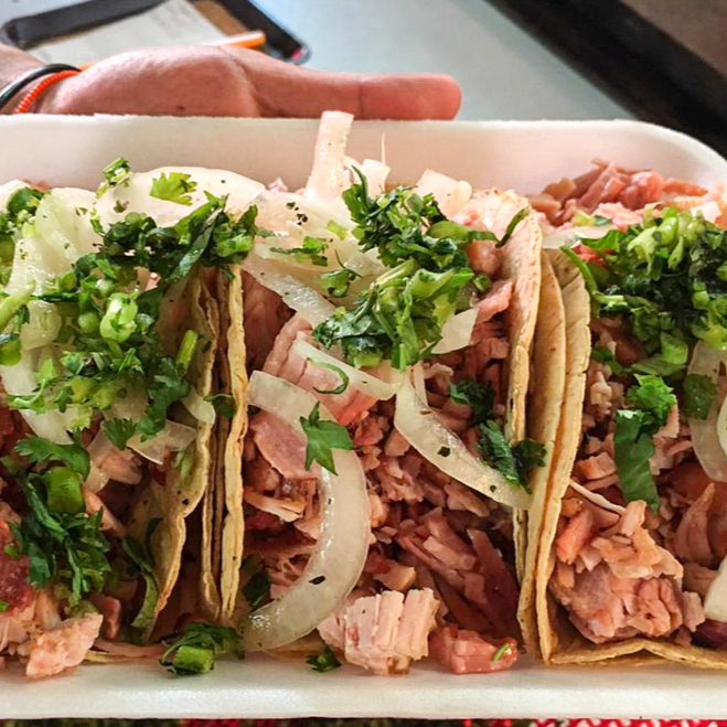 Hechos con tortilla de maíz grande con carne maciza y cuerito, acompañados de cebolla picada y cilantro. Incluye salsa verde, salsa roja y limones