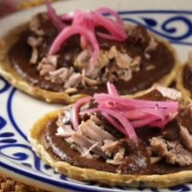 Tortilla de maiz con una cama de frijoles y coronado con Cochinita Pibil