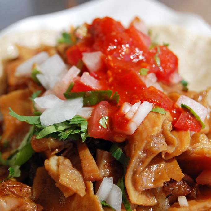 Tortilla frita con cama de frijoles y porcion dew cochinita
