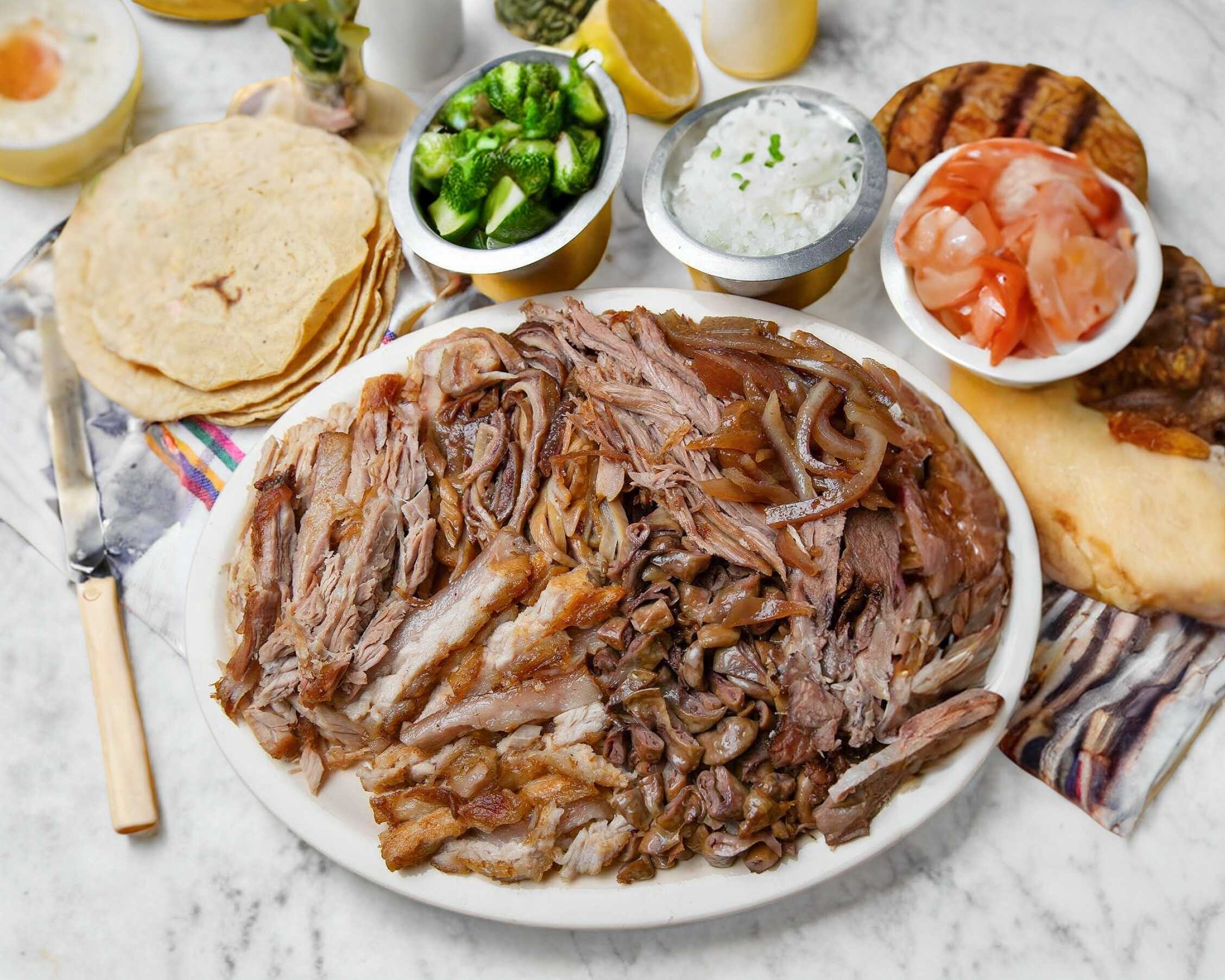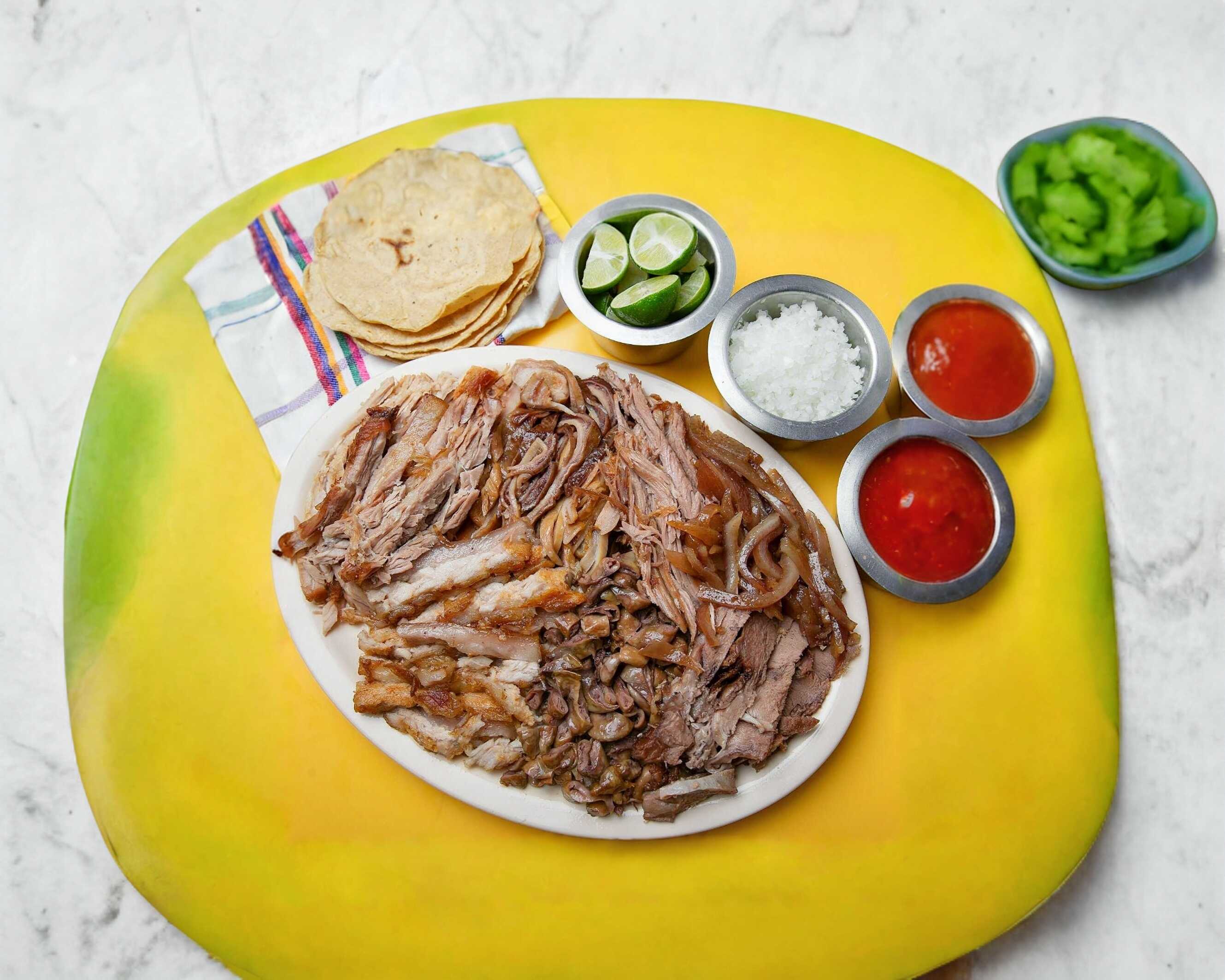 1 kg De carnitas con tortillas, limón, cebolla, salsa roja, salsa verde y chiles en vinagre.