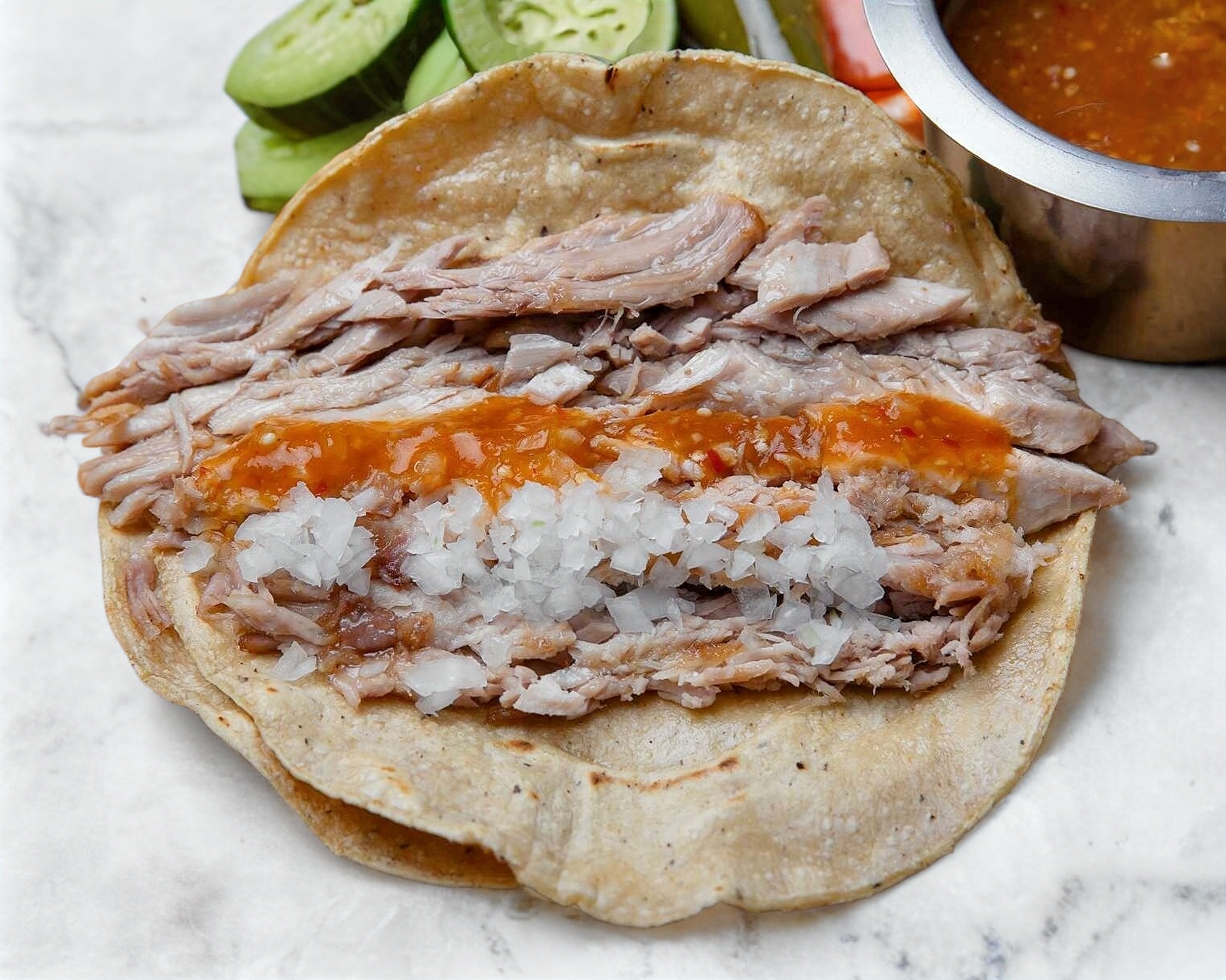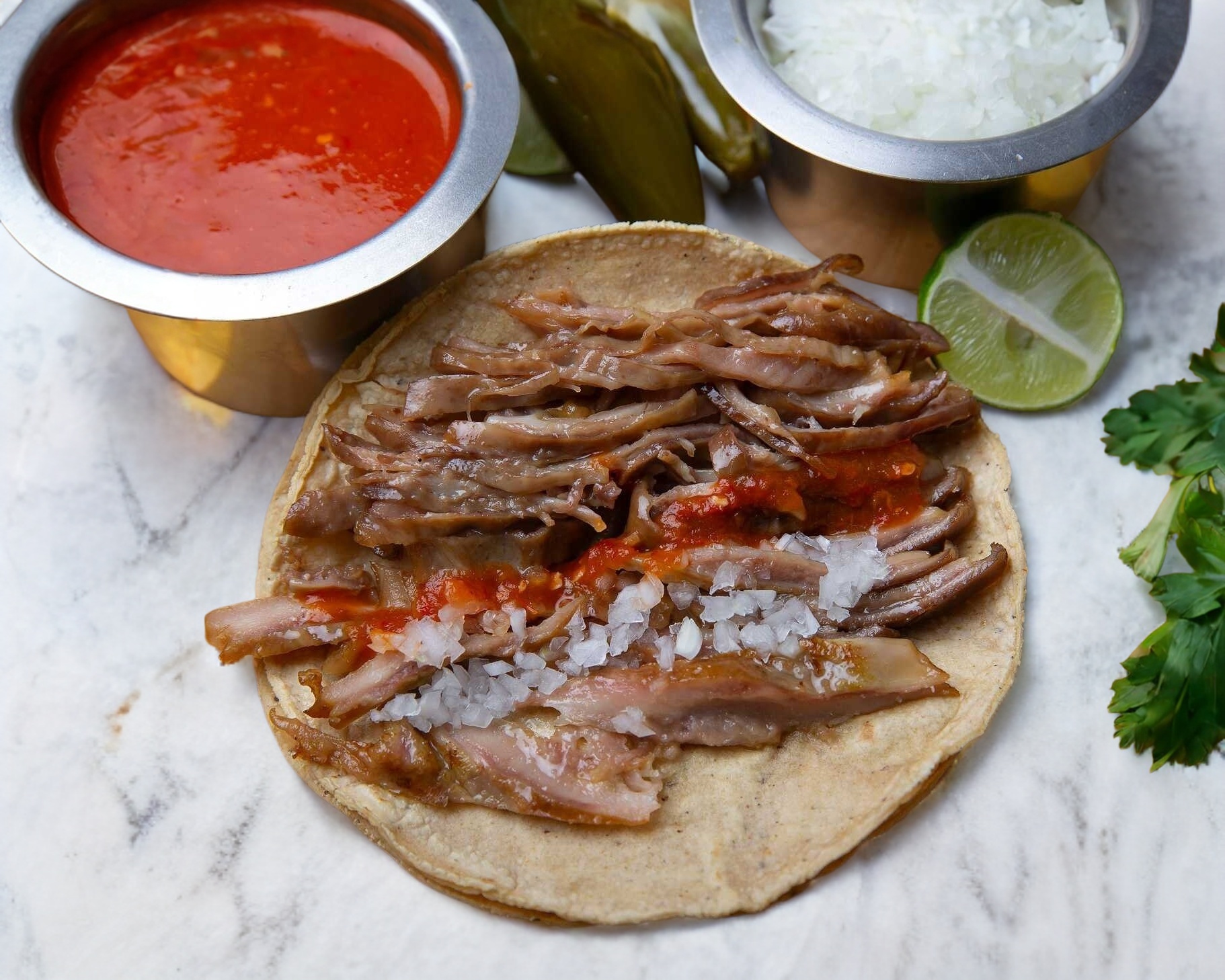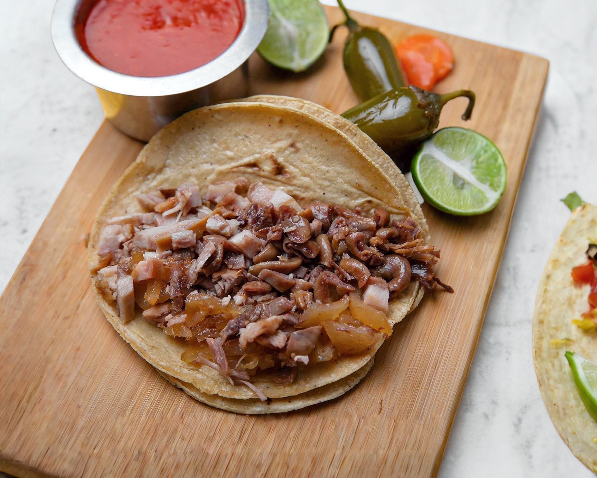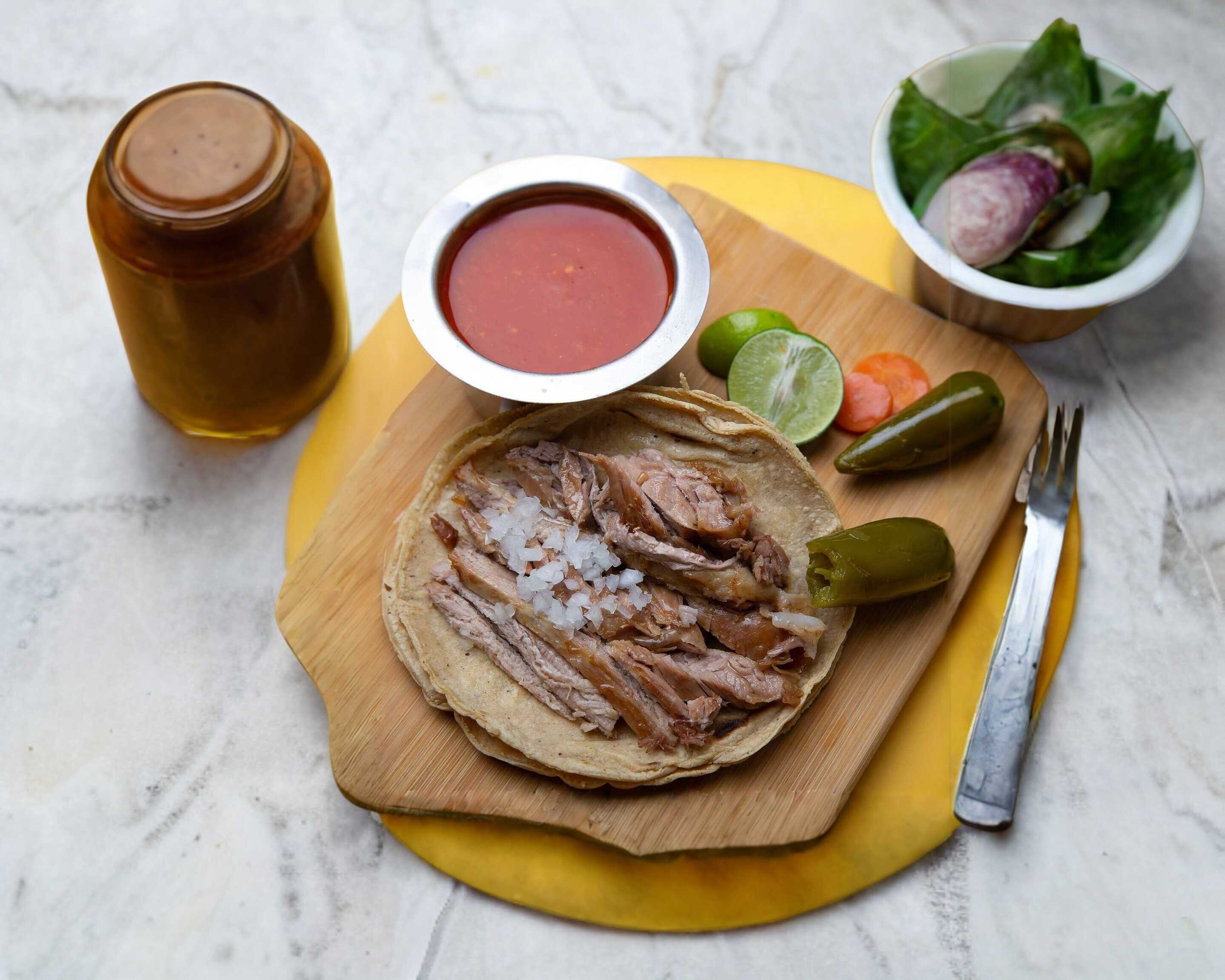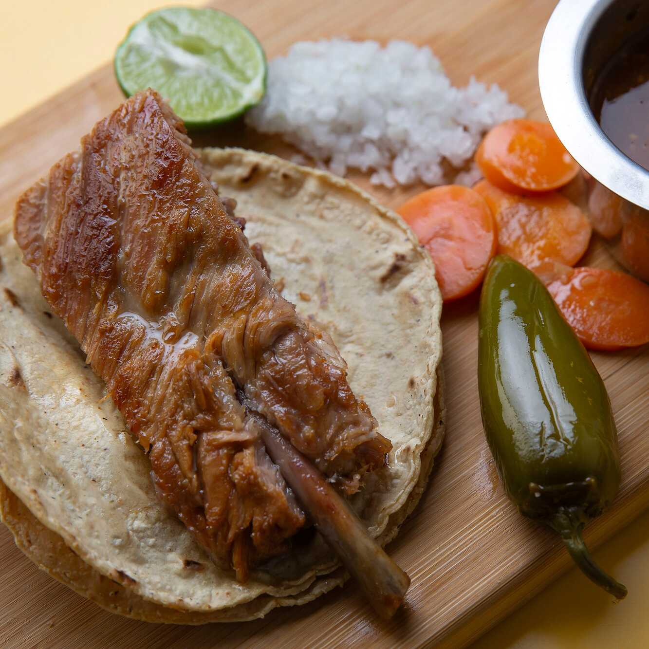 Taco con 2 tortillas y 110 gramos de costilla con hueso en trozo y una sábana de 25 gramos de cuerito delgado encima.