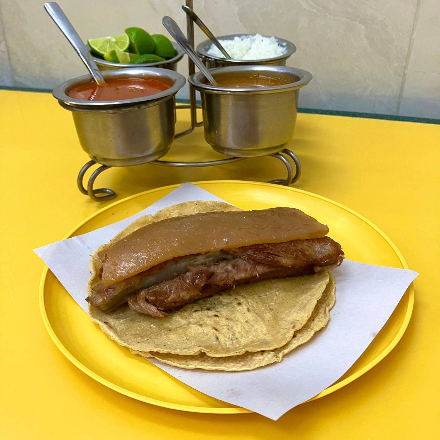 Taco con 70 gramos de cuero delgado y 2 tortillas.